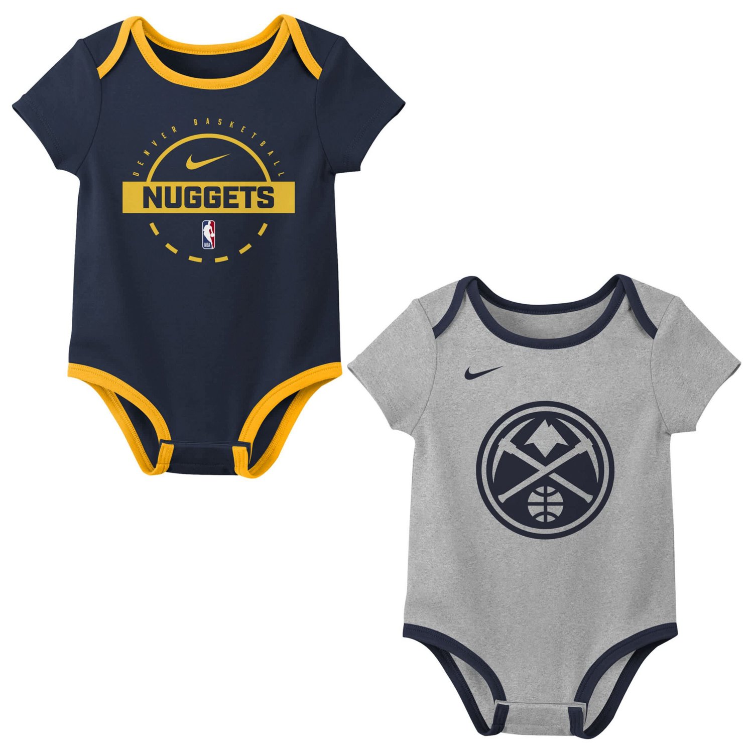 Start their Denver Nuggets fandom early with this Two-Piece Bodysuit Set from Nike The lap shoulder neckline and three-snap closure make changing a breeze ensuring they stay comfortable all day long Both bodysuits feature the team graphics proudly displaying your favorite little one's allegiance to the Denver Nuggets from day one