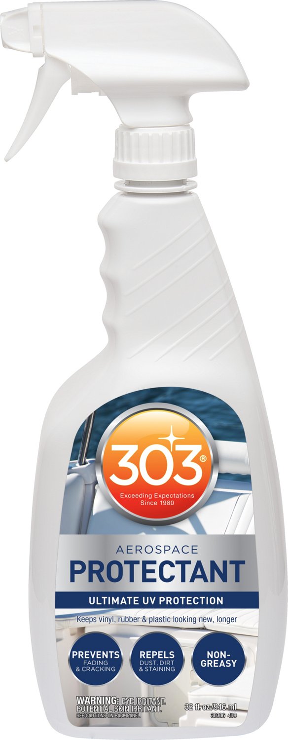 Use this 303® Marine Aerospace Protectant Spray to keep your boat's seats, sails, hull and windows colorful, clean, and protected the sun's harmful UV rays. This spray bottle makes it easy to apply the silicone- and petroleum distillate-free formula onto vinyl, Plexiglas, carbon fiber, rubber, plastic and finished leather surfaces. Made in USA.