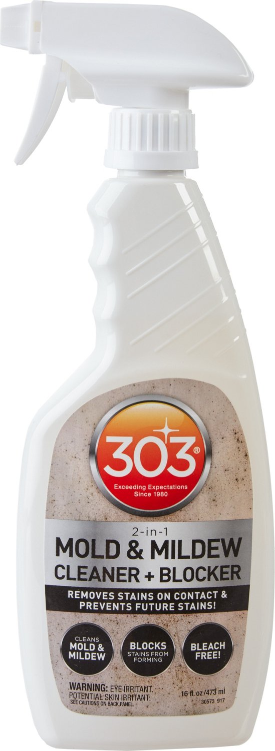 Clean up your boat with the 303 Mold and Mildew Cleaner and Blocker. It works fast to remove mildew and mold stain on contact, and it also prevents the mold and mildew stains from re-occurring. It does not contain bleach, and it works on most water-safe surfaces, such as vinyl, plastic, painted surfaces and fabrics.
