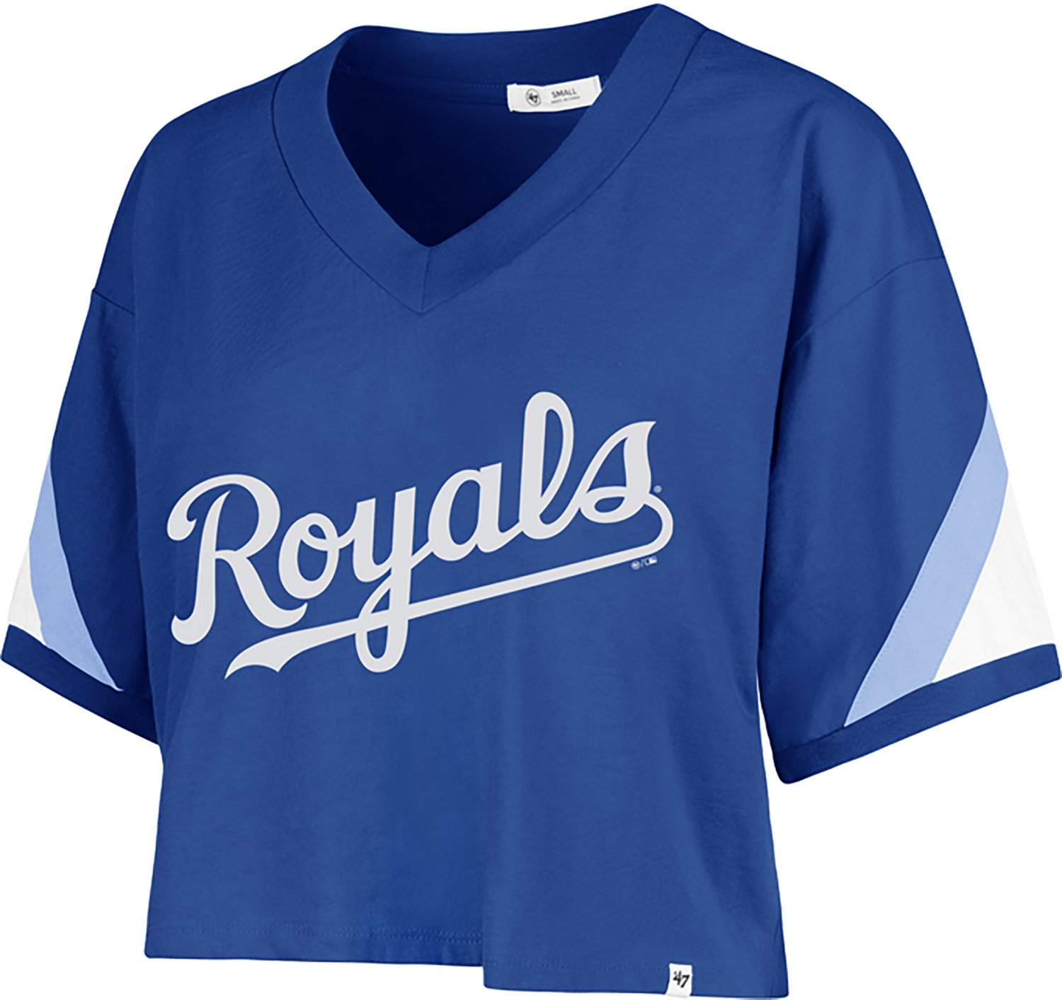 Root for your favorite team when you wear the '47 Women's Kansas City Royals Geo Cropped Short Sleeve V-Neck T-shirt. It is made of 100% cotton. The short sleeves keep you cool, and its V-neck shows off your collarbones. The Kansas City Royals logo printed on the front shows off your team spirit.