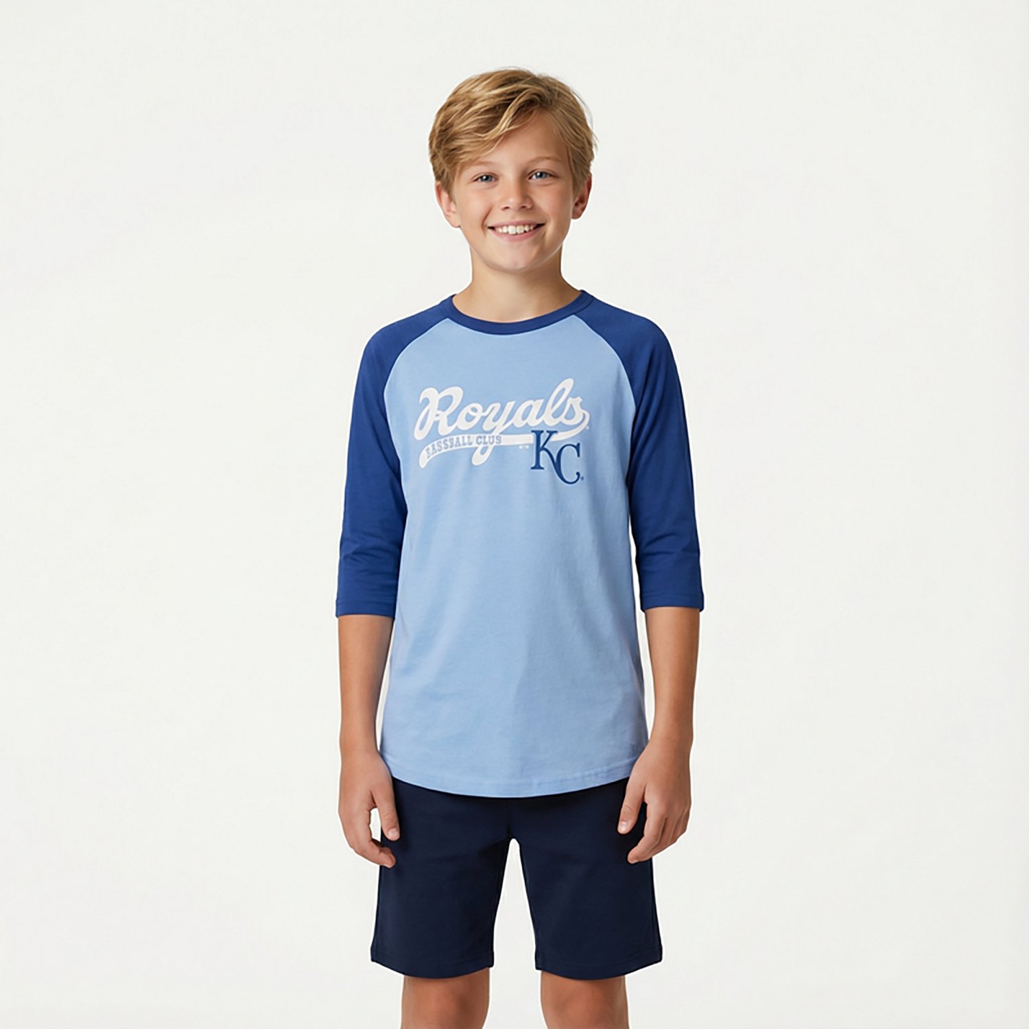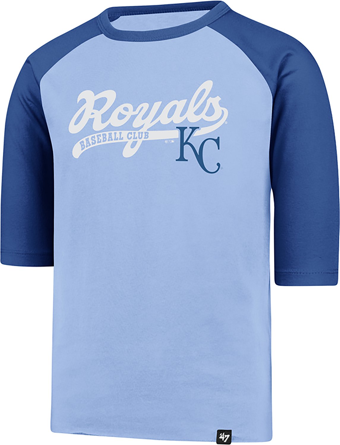 Stay comfortable through the wildest of games in the 47 Brand Youth Royals Super Script Line Drive Raglan Shirt. The T-shirt features your team's logo graphic, along with a comfortable cut and material that deliver a classic look and feel that you'll love for game day.