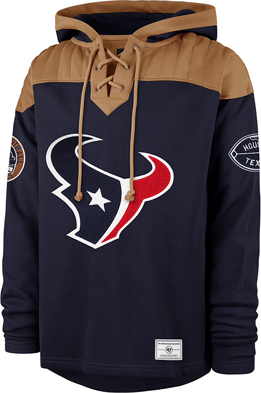 Show your support in style with the 47 Brands Men's Houston Texans Flannagan Wingback Lacer Long Sleeve Hoodie. The cotton-polyester fleece material is soft and cozy, and the Houston Texans twill appliques show your fandom with pride.