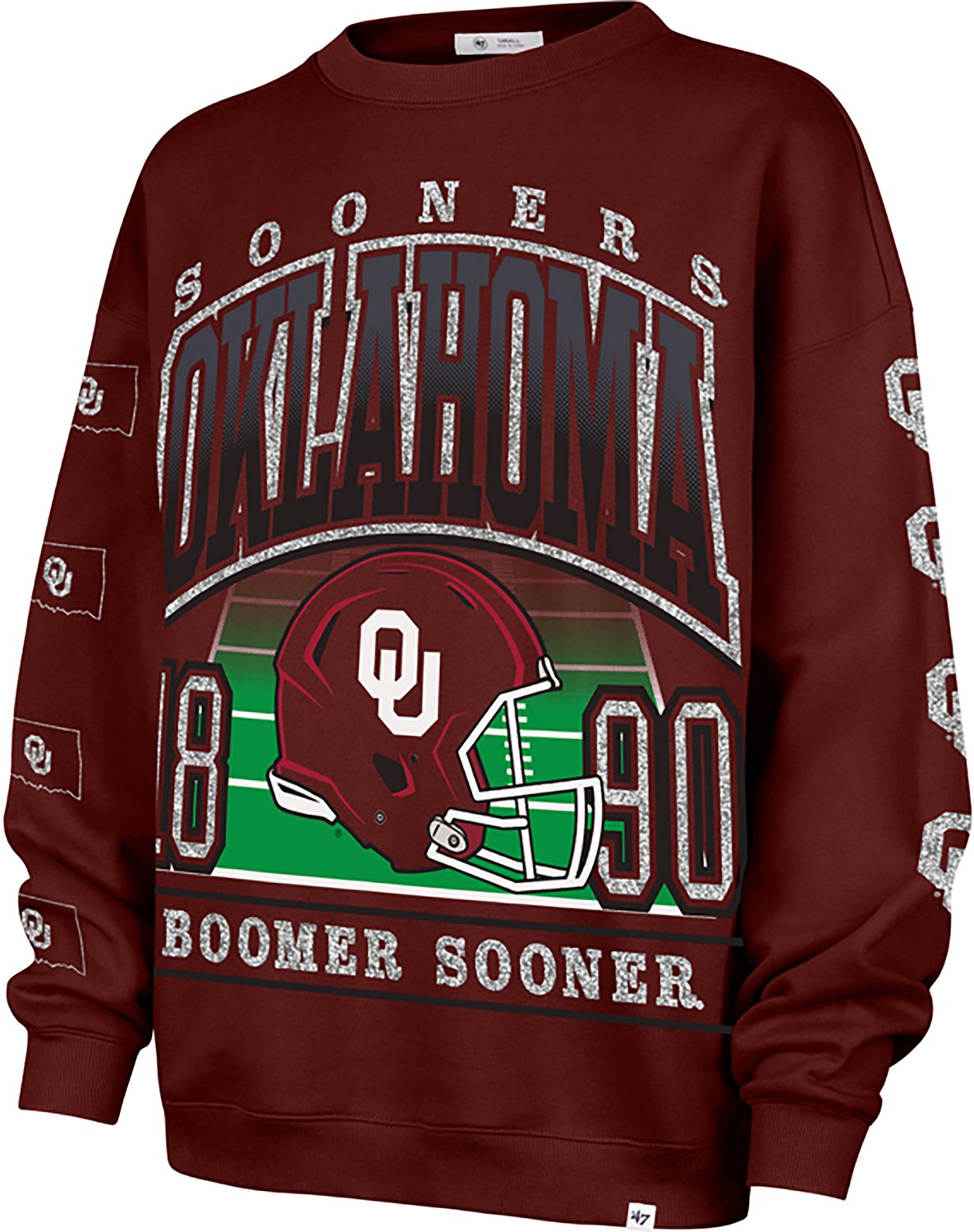 Oversized University of Oklahoma Sooners graphics with glitter accents screen prints