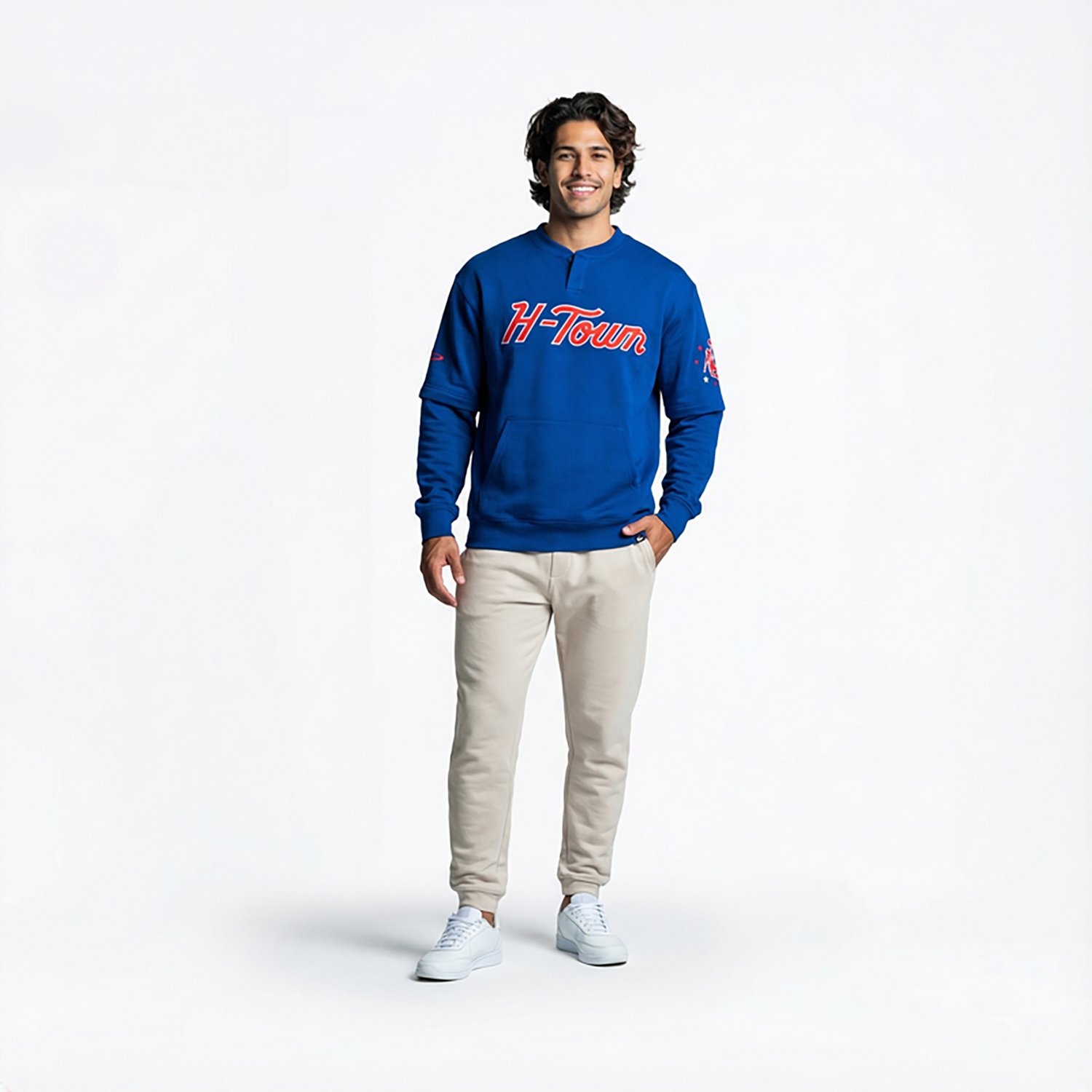 Features and Benefits Fleece fabric provides warmth and comfort Long sleeves Crew neck Graphic design for style Specifications Clothing Type: Fleece Neckline: Crew Neck Sleeve length: Long Sleeve Activity: Pro Sports Material: Fleece Heat Retention: Yes Gender: Men's Zipper: No Zipper Size Range: Men's Moisture Wicking: No Care: Machine wash cold Product Type: Sweaters Age Group: Adults' Style: Pullover Sweatshirts Hood: No What's in the Box '47 Houston Rockets Off Glass Double Crew Sweater