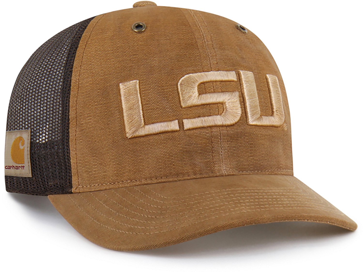 Gear up for game day with the '47 Louisiana State University Carhartt Garment Dyed Trucker Cap. The Carhartt garment-dyed canvas and hard mesh fabric provides comfort and breathability, while the adjustable plastic snapback closure offers a custom fit. The raised embroidered logo shows off your Tigers pride.