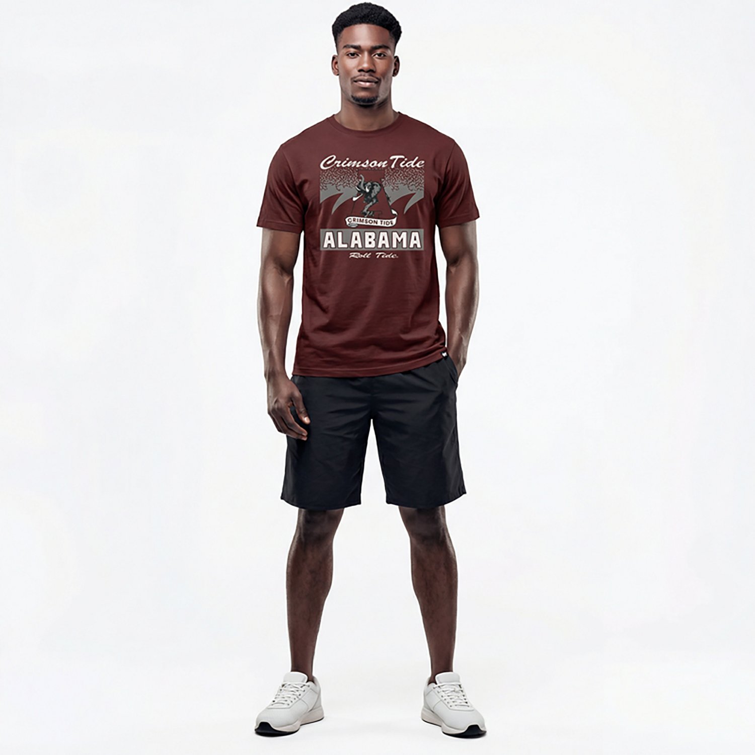 Make sure everyone knows which school you cheer for by throwing on the 47 Men's Alabama Waver Franklin T-shirt. This T-shirt is made of lightweight cotton with short sleeves for casual comfort and features a team graphic on the chest that is distressed for a vintage style.