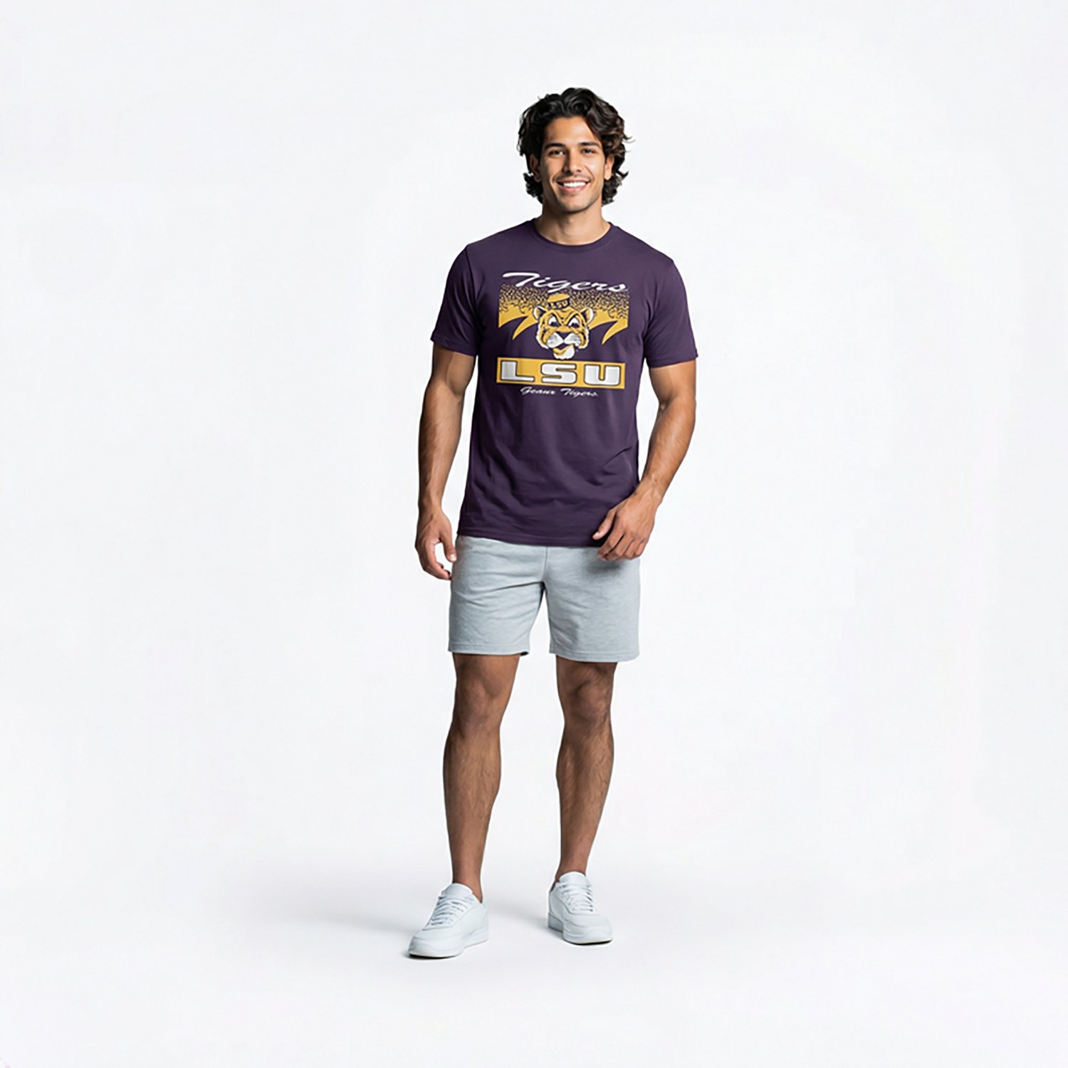 Make sure everyone knows which school you cheer for by throwing on the 47 Men's LSU Waver Franklin T-shirt. This T-shirt is made of lightweight cotton with short sleeves for casual comfort and features a team graphic on the chest that is distressed for a vintage style.