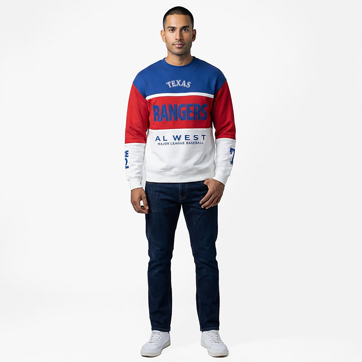 Make your outfit pop by wearing the 47 Men's Rangers On Five Maximalist Long Sleeve Crew. This pullover features sports fleece and long sleeves to help keep your comfortable in cool temperatures, and its team details bring a bold look.