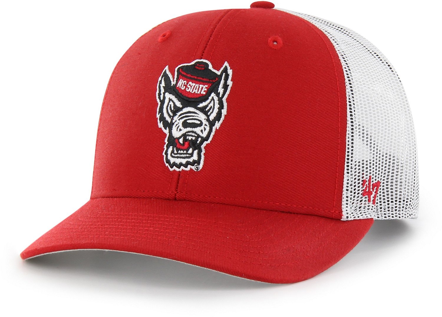 Represent the Wolfpack by wearing the '47 North Carolina State University Trucker Cap. The cotton and mesh construction provides breathable comfort, while the plastic snapback can be adjusted for a secure fit. The embroidered North Carolina State logo displays your team spirit.