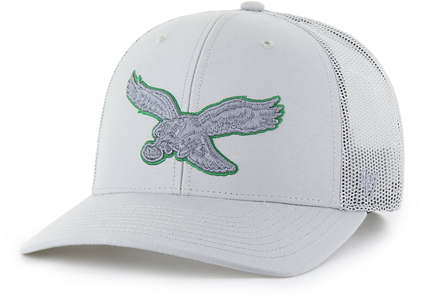 Add a touch of team spirit to your outfit with this '47 Philadelphia Eagles Adults' Trucker Cap. It features a mid-crown construction with a curved visor for a structured look that helps keep the sun out of your eyes, and the cap has an adjustable plastic snapback closure for a customizable fit. Features a raised embroidery team logo on the front.