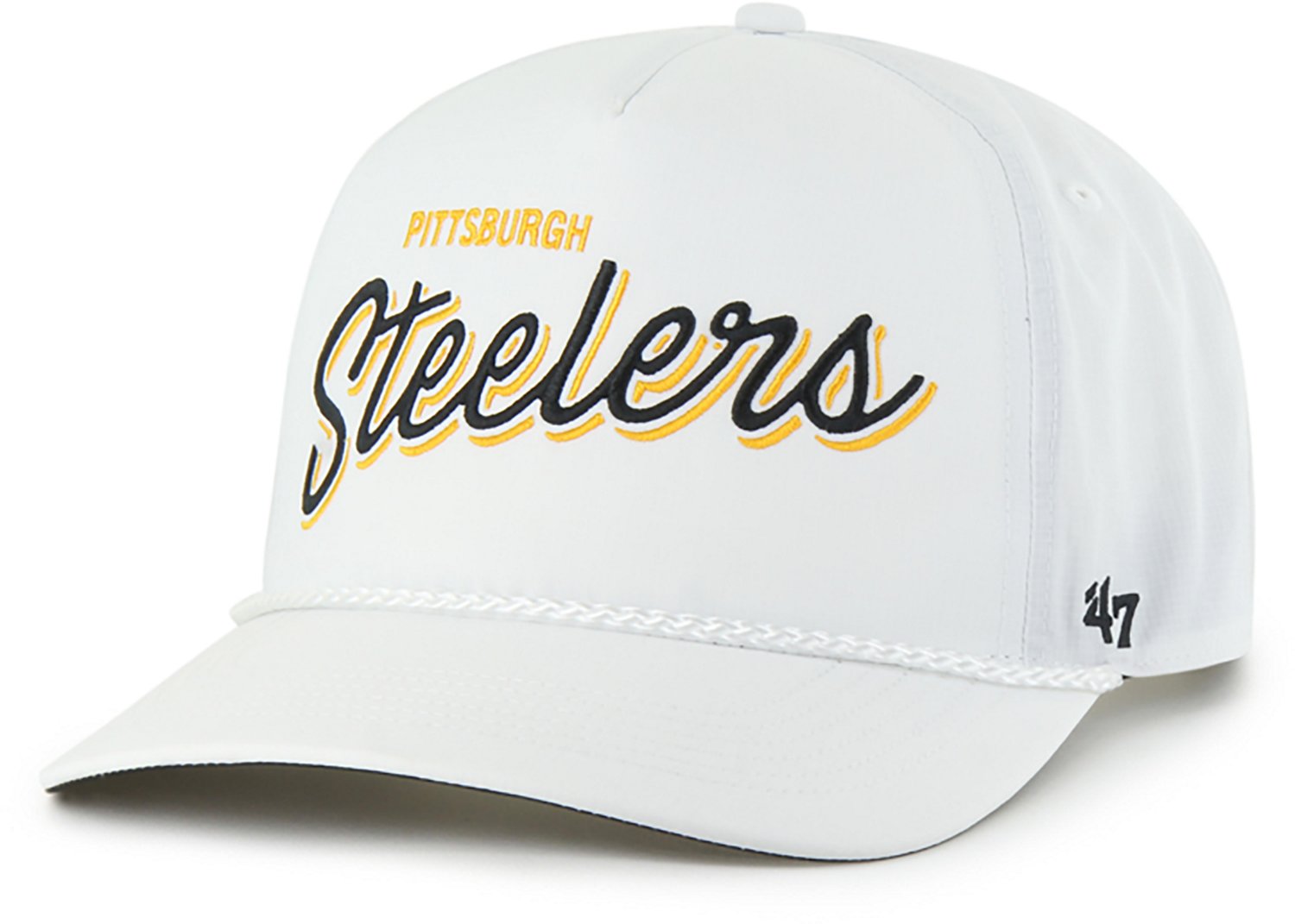 Features and Benefits Made of brrr ripstop nylon for cool wear 5-panel design with a pinched front Braided visor rope Relaxed fit Snap closure offers a secure fit Embroidered team design showcases your fandom Specifications Clothing Type: Hats Closure: Snap Product Type: Hats Age Group: Adults' Activity: Pro Sports Style: Cap Gender: Men's What's in the Box 47 Steelers BRR Fairway Hitch Cap