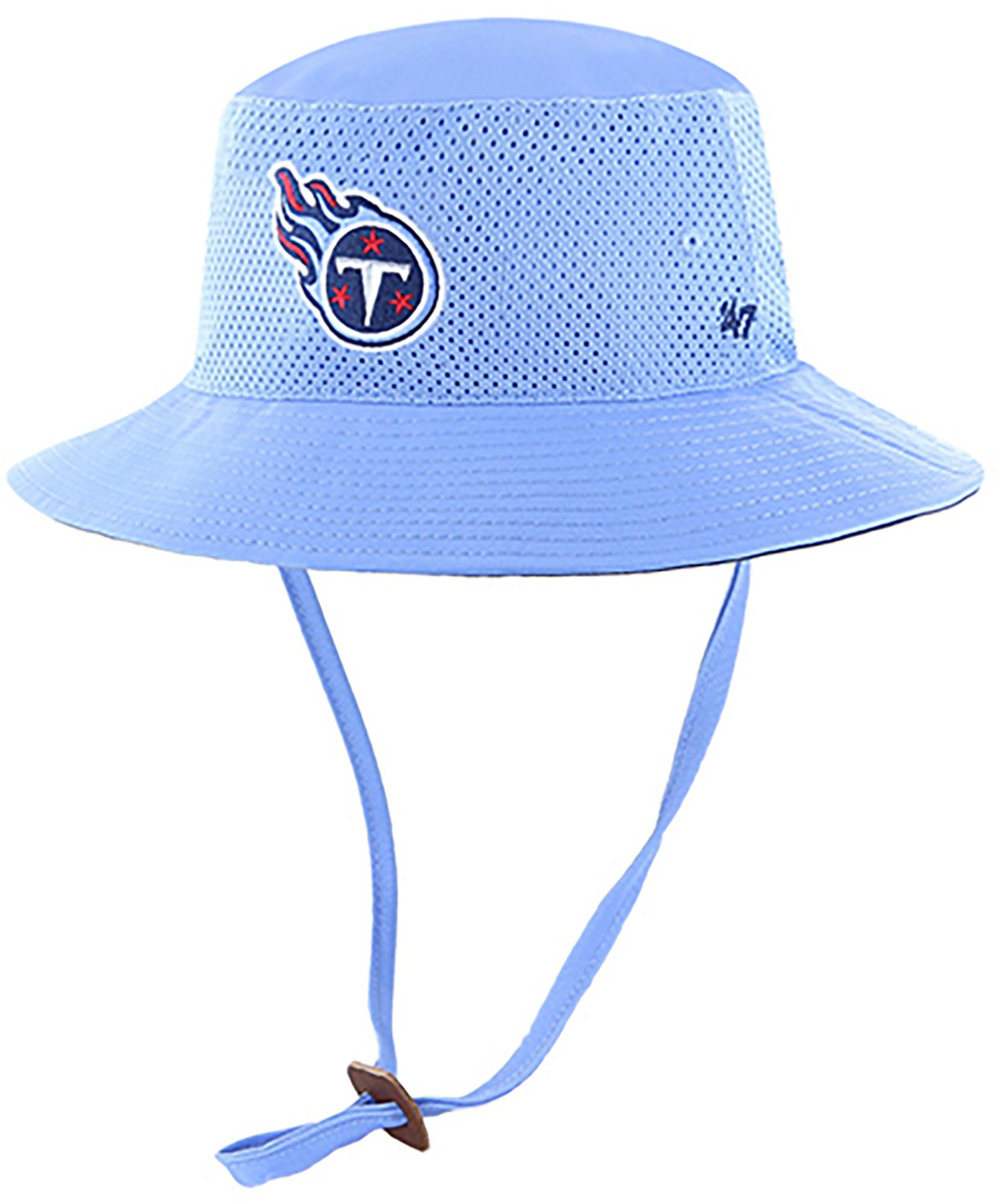Kick back and relax with the '47 Tennessee Titans Panama Pail Bucket Hat. The polyester material provides a comfortable feel, while the adjustable chin strap offers a custom fit. The mesh panels promote breathability, and the team logo shows off your Titans pride.