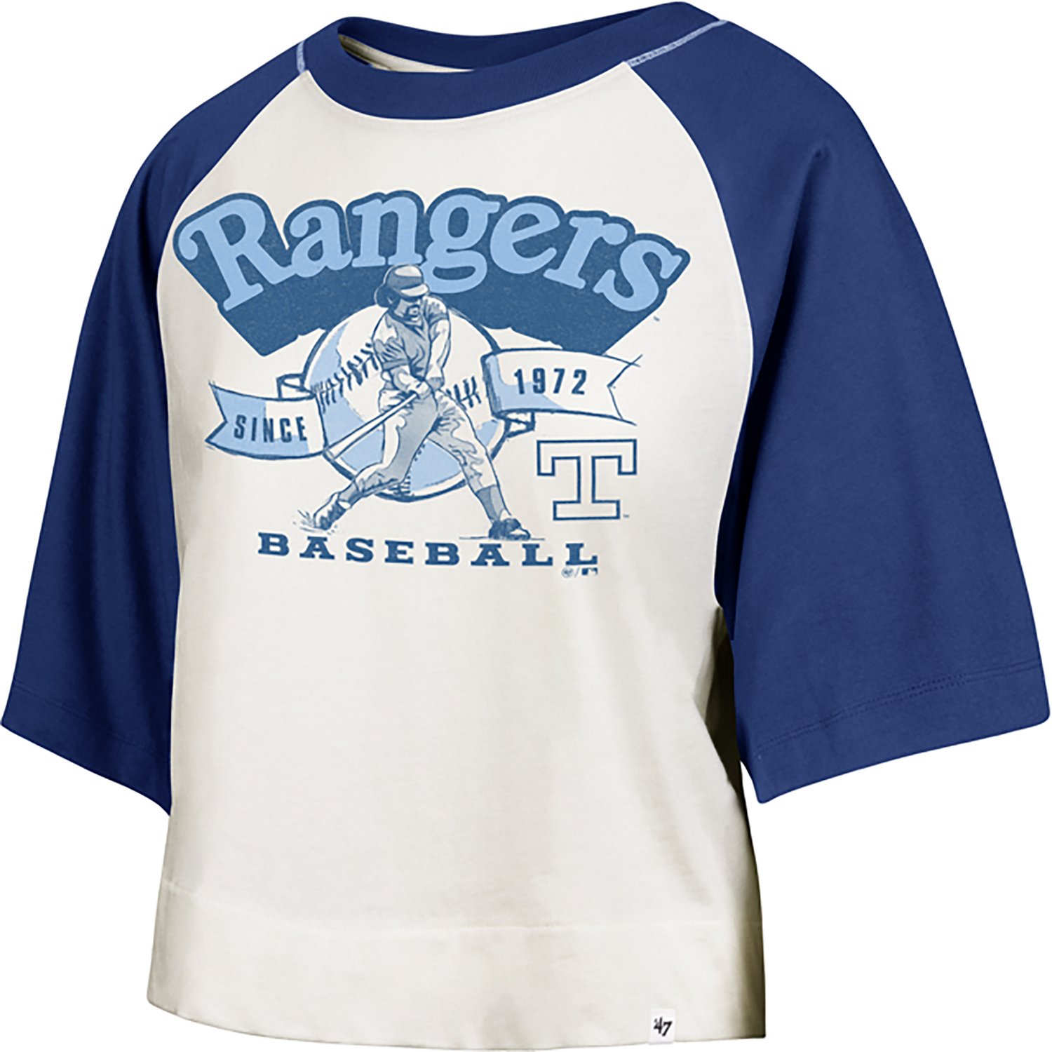 Show off your team spirit when you wear the '47 Texas Rangers Women's Infield Shift Raglan Crop Graphic T-shirt. The cotton material provides a comfortable feel, while the screen-printed graphic design lets everyone know you're a Rangers fan.