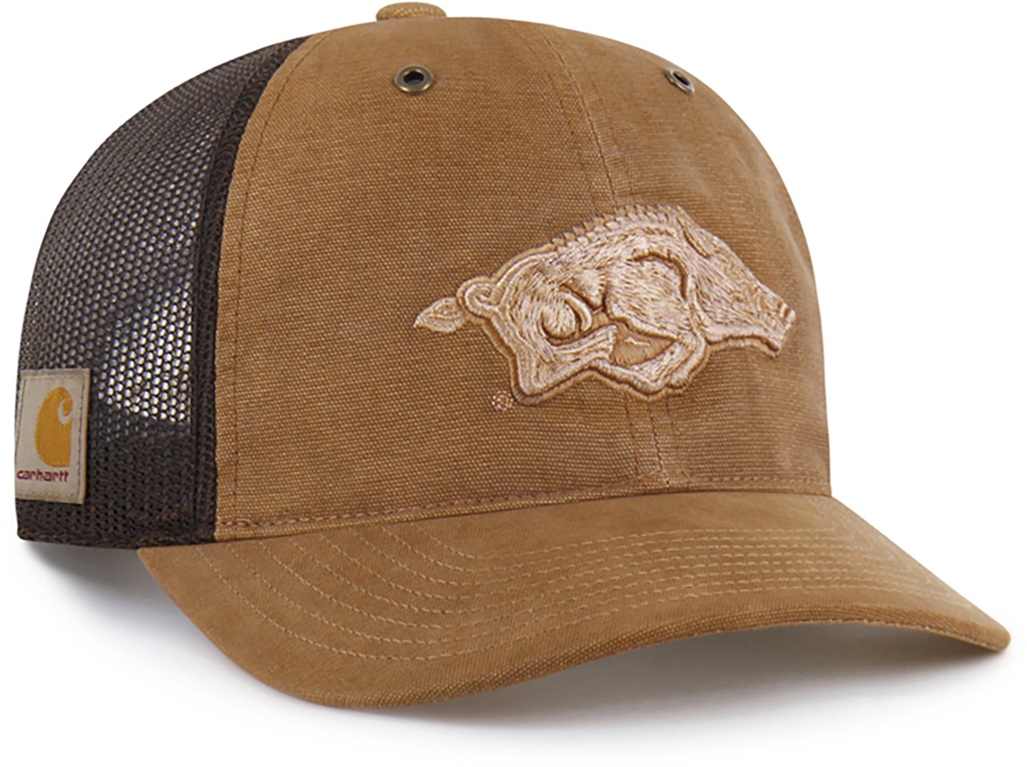 Gear up for game day with the '47 University of Arkansas Carhartt Garment Dyed Trucker Cap. The Carhartt garment-dyed canvas and hard mesh fabric provides comfort and breathability, while the adjustable plastic snapback closure offers a custom fit. The raised embroidered logo shows off your Razorbacks pride.