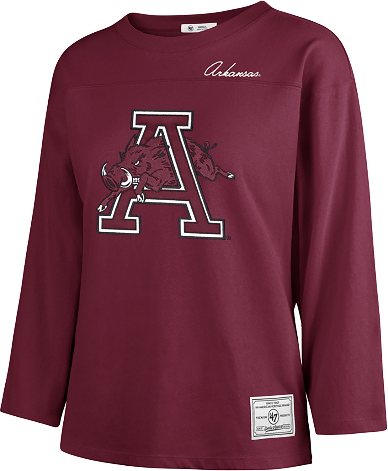 Get pumped to watch the next game by throwing on the 47 Women's Arkansas Game Nod Timeless 3/4 Sleeve T-shirt. This T-shirt is made of 100% heavyweight cotton jersey to help keep you feeling good and features a team graphic on the front to express your fan pride.