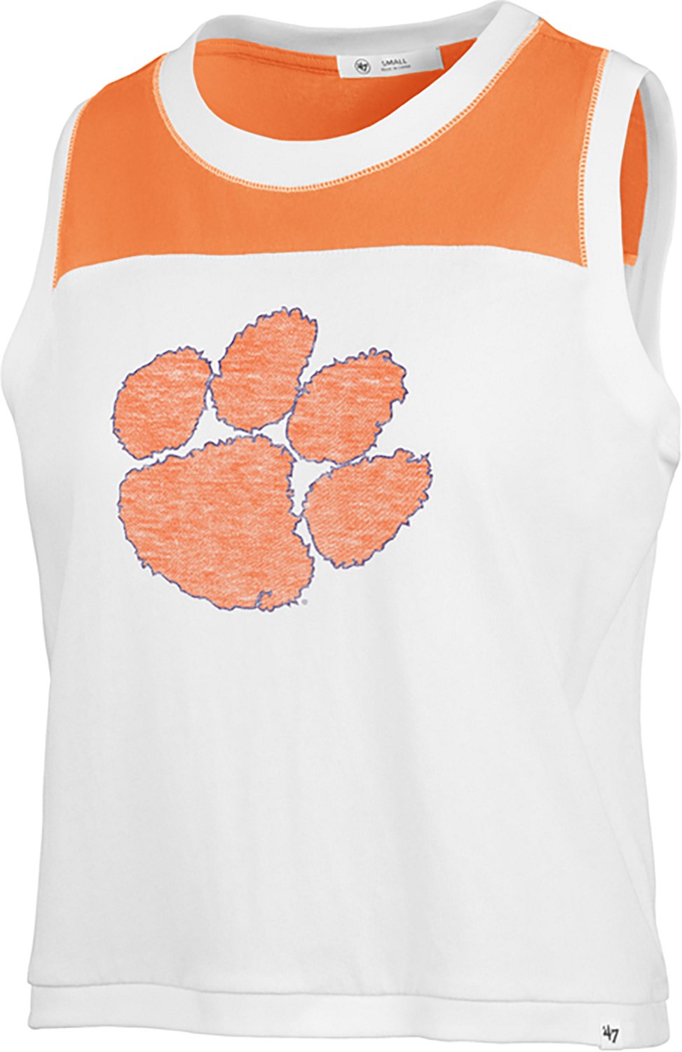 Add style to your gameday wardrobe with the '47 Women's Clemson University Premier Zoey Tank Top. The soft cotton keeps you comfortable and cool all day, while the cropped droptail hem and flatlock stitching create a classic style. The distressed Clemson graphic shows off your Tigers pride.