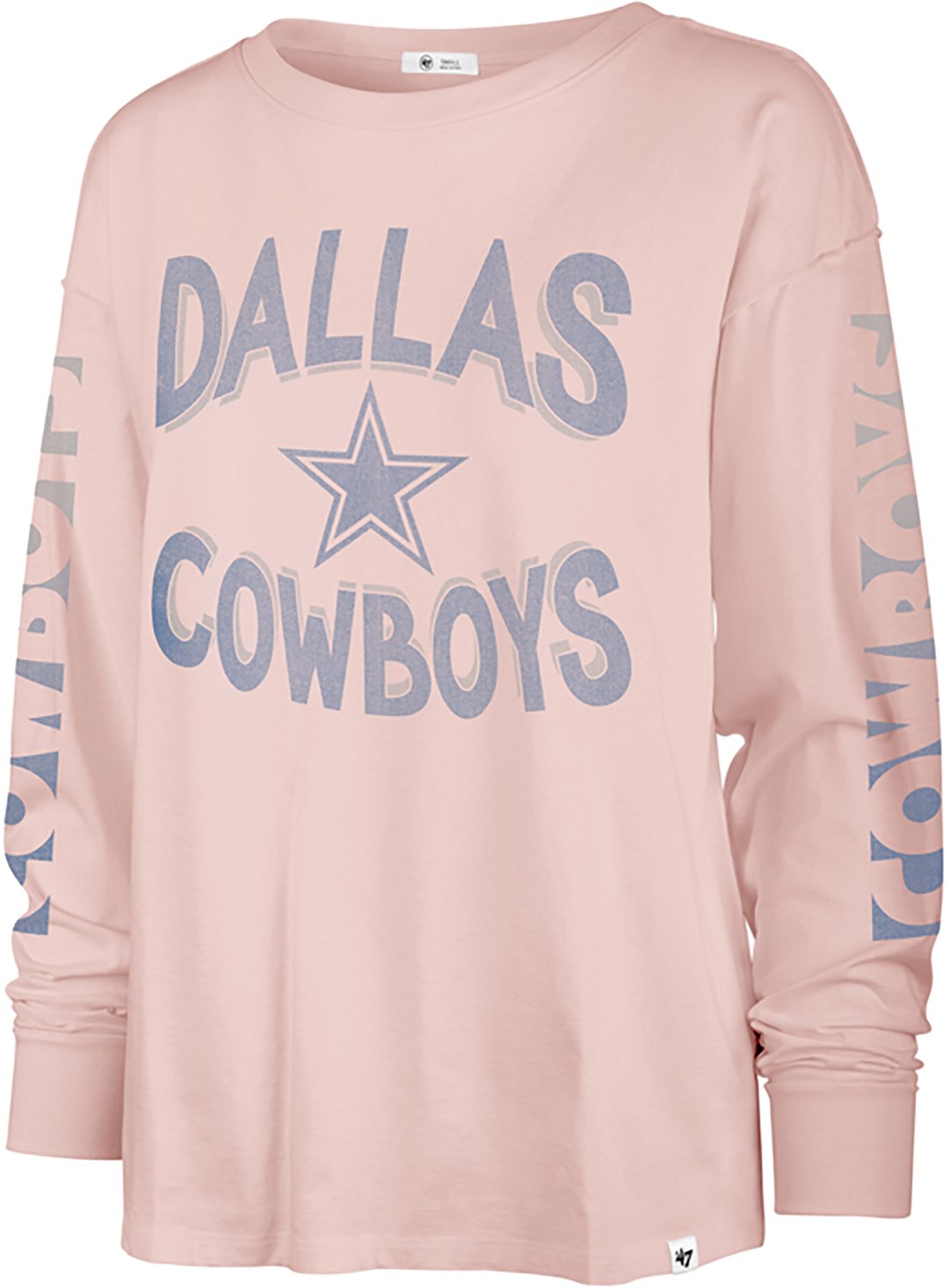Support your team in style with this '47 Women's Cowboys Cloud Nine SOA Long Sleeve T-shirt. It is made of 100% cotton for a soft and comfortable feel, and the T-shirt features a Dallas Cowboys wordmark and logo on the chest and gradient-style Cowboys wordmarks on both sleeves.