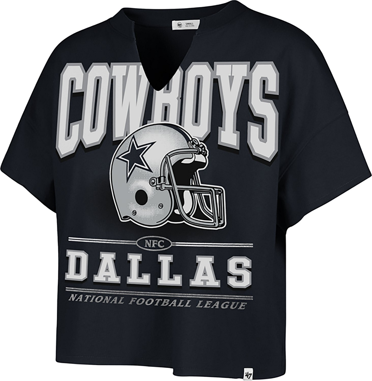 Make the most of your time with fellow Cowboys fans by wearing the '47 Women's Dallas Cowboys Elation Oversized Notched T-shirt. This T-shirt is made of 100% cotton and features a boxy, cropped style for a comfortable design, and its front boasts an oversized screen print of the team name and helmet.