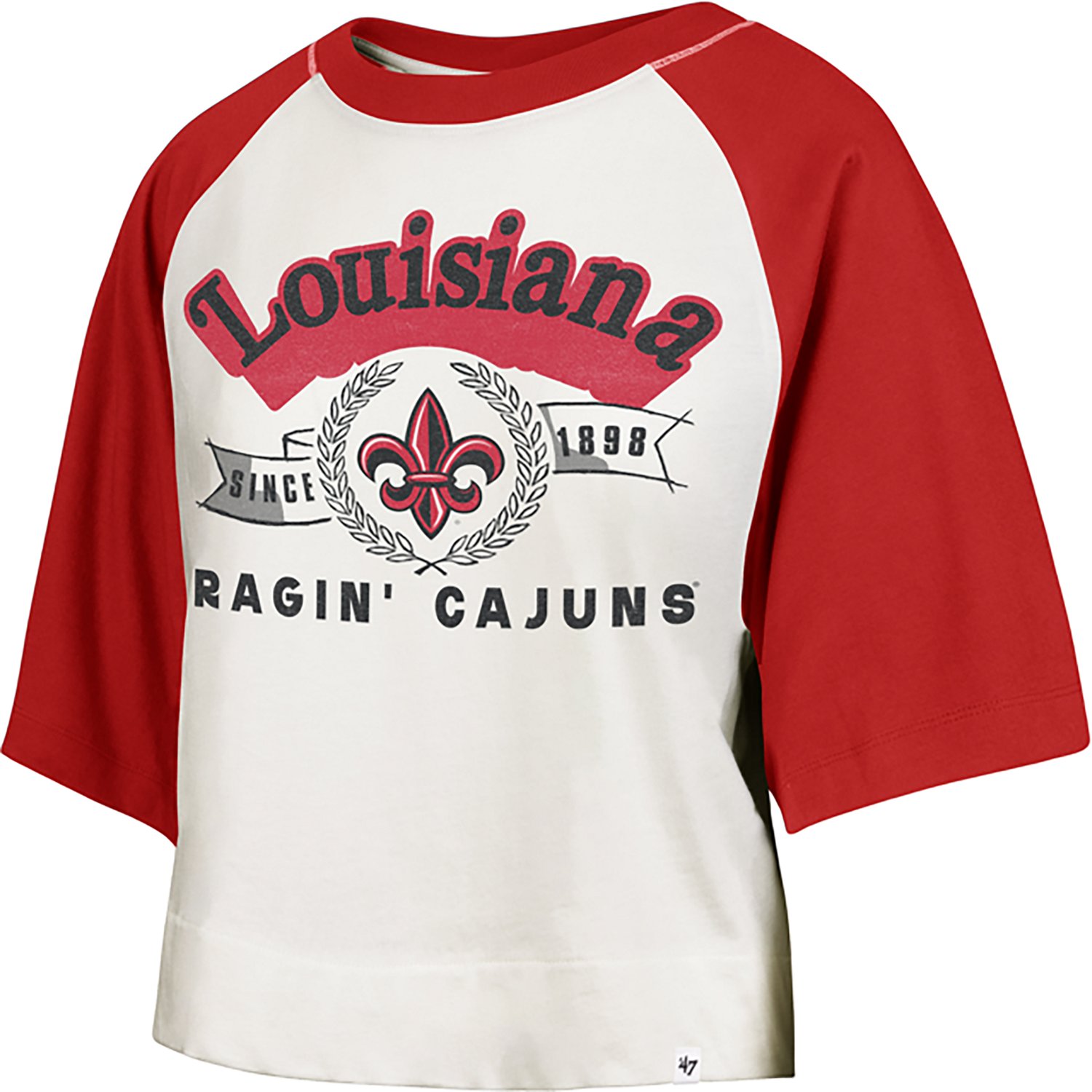 Show off your fan support when you wear the 47 Women's Louisiana-Lafayette Infield Shift Raglan Crop T-shirt. The shirt is made of 100% cotton fabric to help keep you comfortable throughout the day, while the screen-printed team design puts your fandom on display.