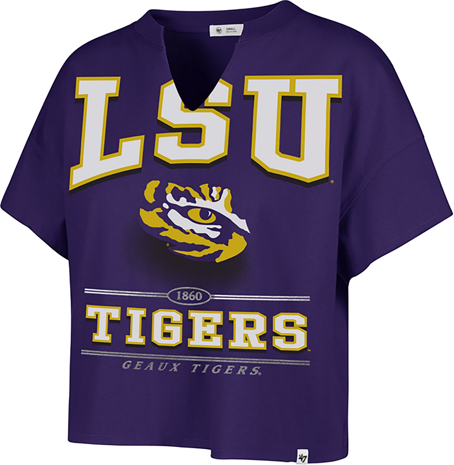 Make it clear you're a dedicated fan when you wear the 47 Women's LSU Elation Oversize Notch Neck T-shirt. The cotton construction helps keep you comfortable throughout the day, while the screen-printed team graphics put your fan pride front and center.