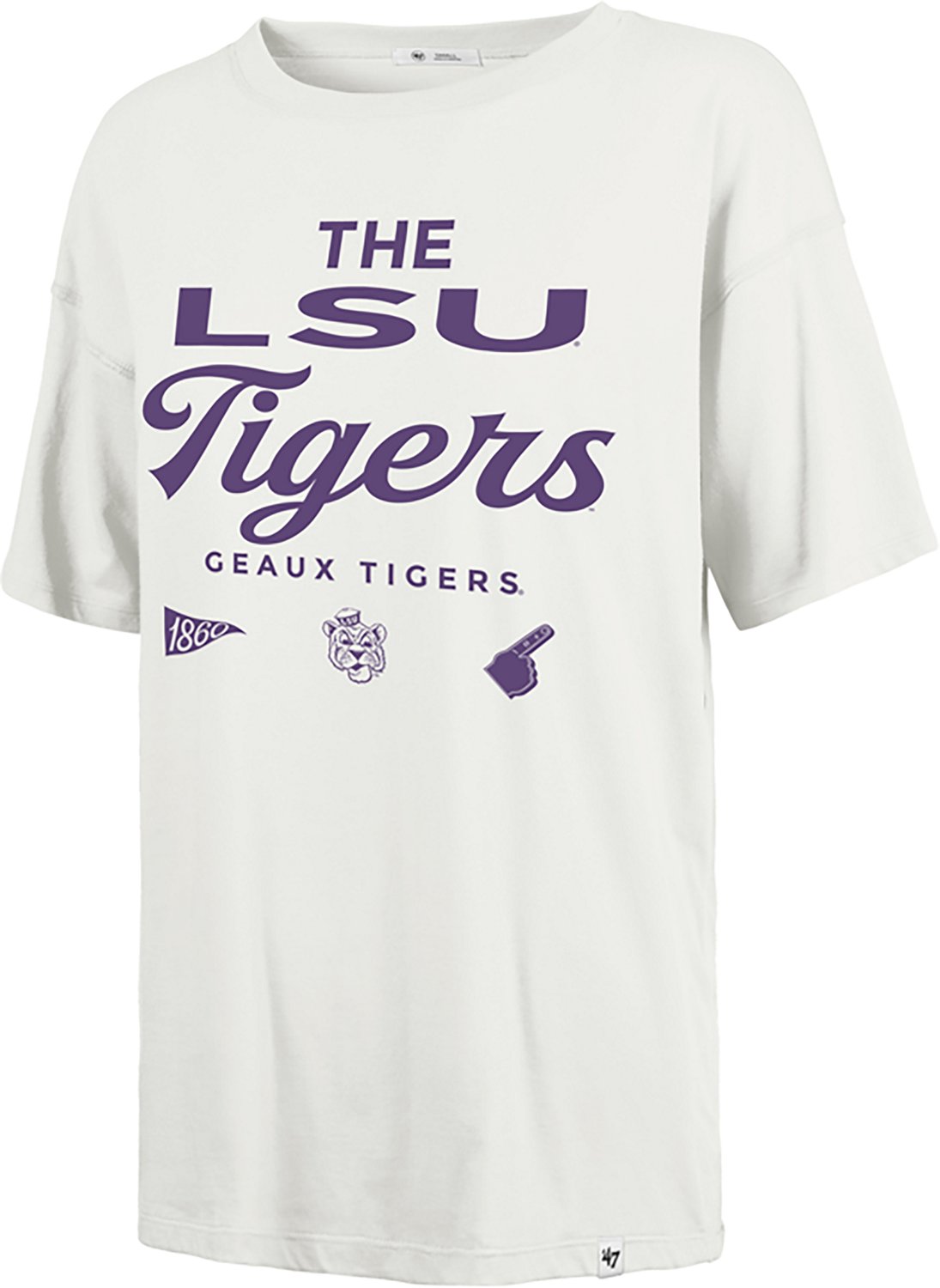 Root for your favorite team when you wear the '47 Women's LSU Tigers Show Off Sadie Short Sleeve T-shirt. It is made of 100% cotton. The crew neckline creates a casual look, and its drop shoulders create an oversized look. The screen printed LSU Tigers graphic on front and back shows off your team spirit.