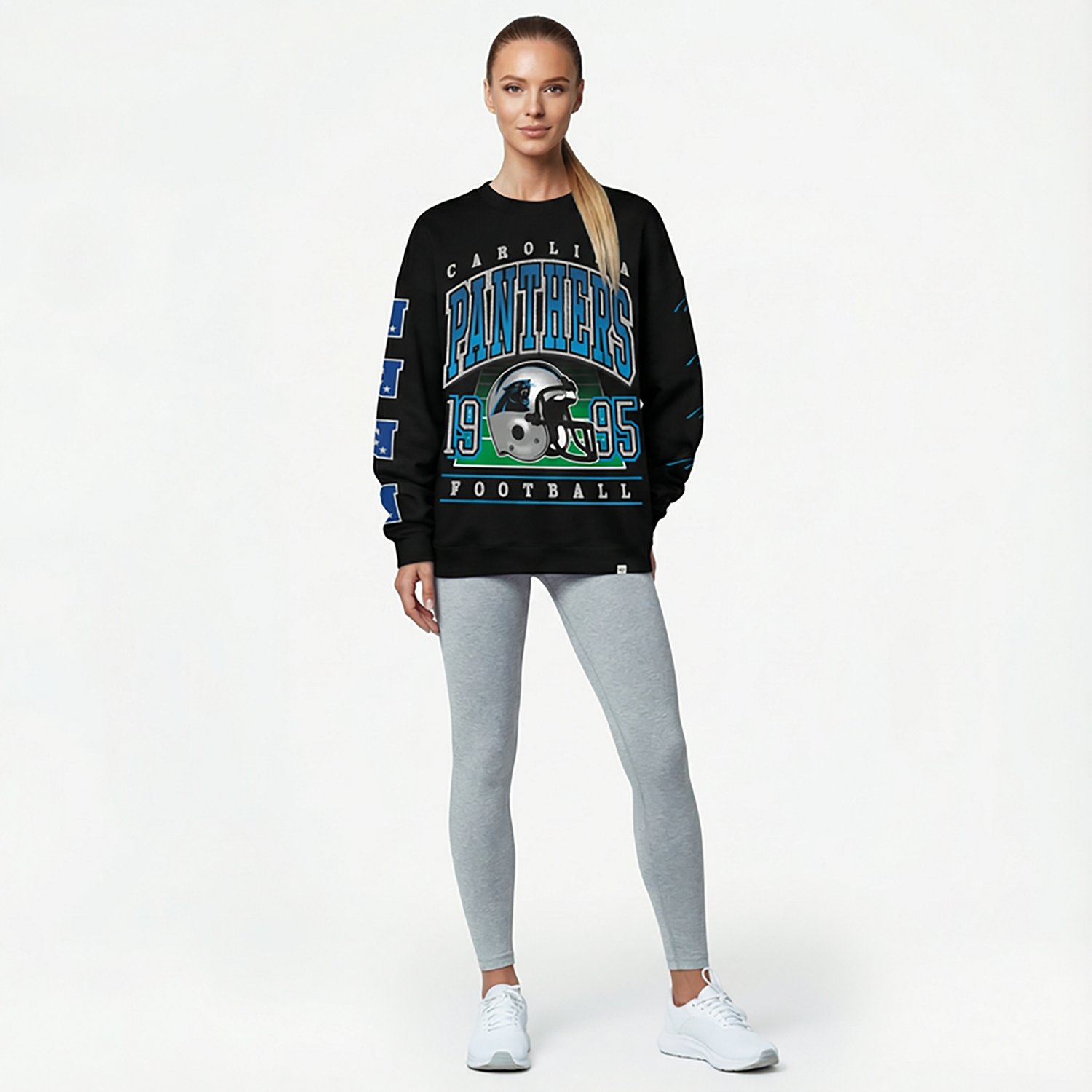 Put your love for your team on display with the 47 Women's Panthers Go Big Oversize Long Sleeve Crew Sweatshirt. The midweight sport fleece construction offers a soft, comfortable feel, while the screen-printed team graphic shows off your fandom.