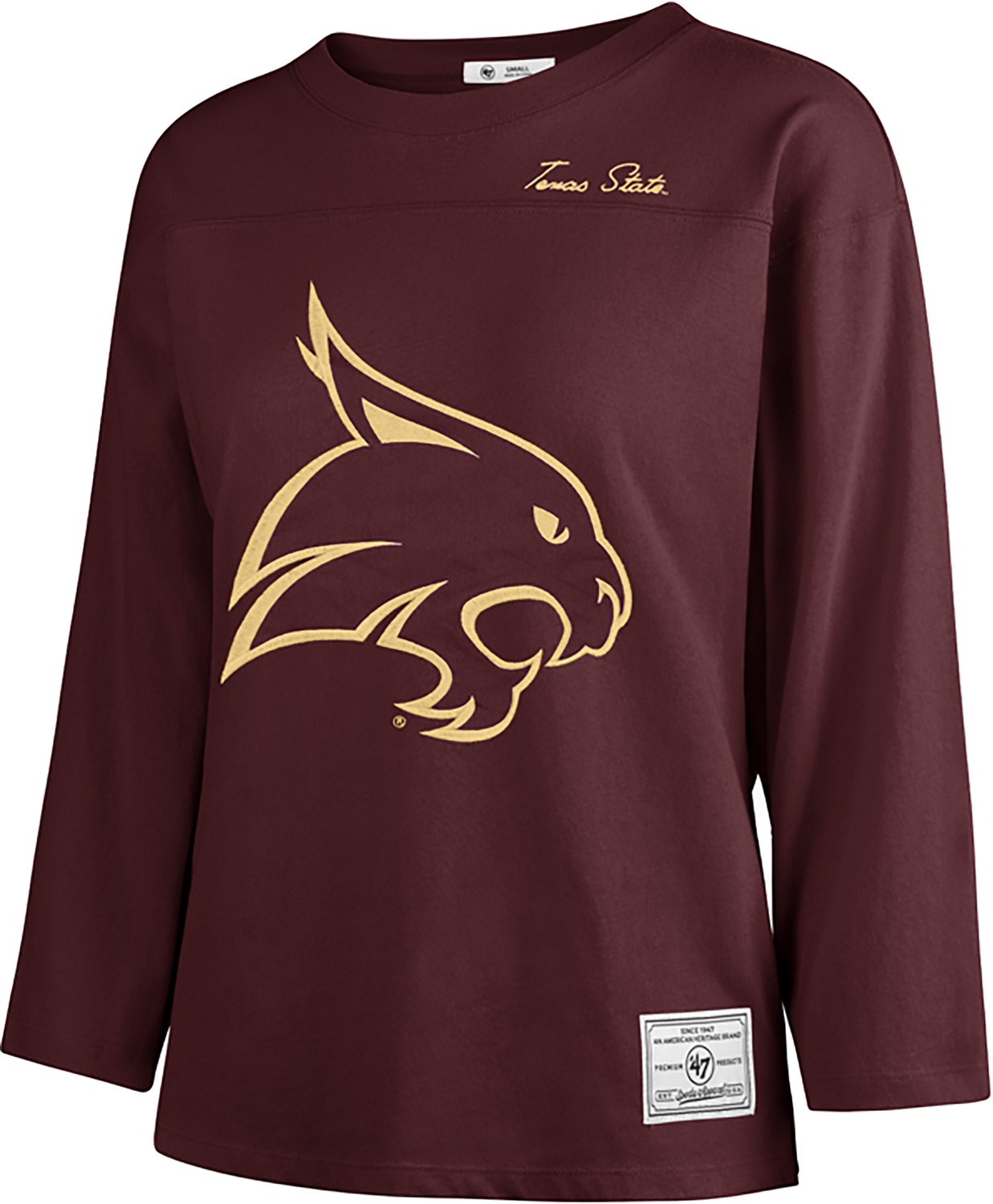 Make sure everyone knows which team you'll be cheering on by watching the game in the 47 Women's Texas State Game Nod Timeless 3/4 Sleeve T-shirt. This T-shirt is made of 100% cotton jersey to help wearers stay comfortable and features an appliqué logo and a cotton chain stitch script to add a stylish touch.