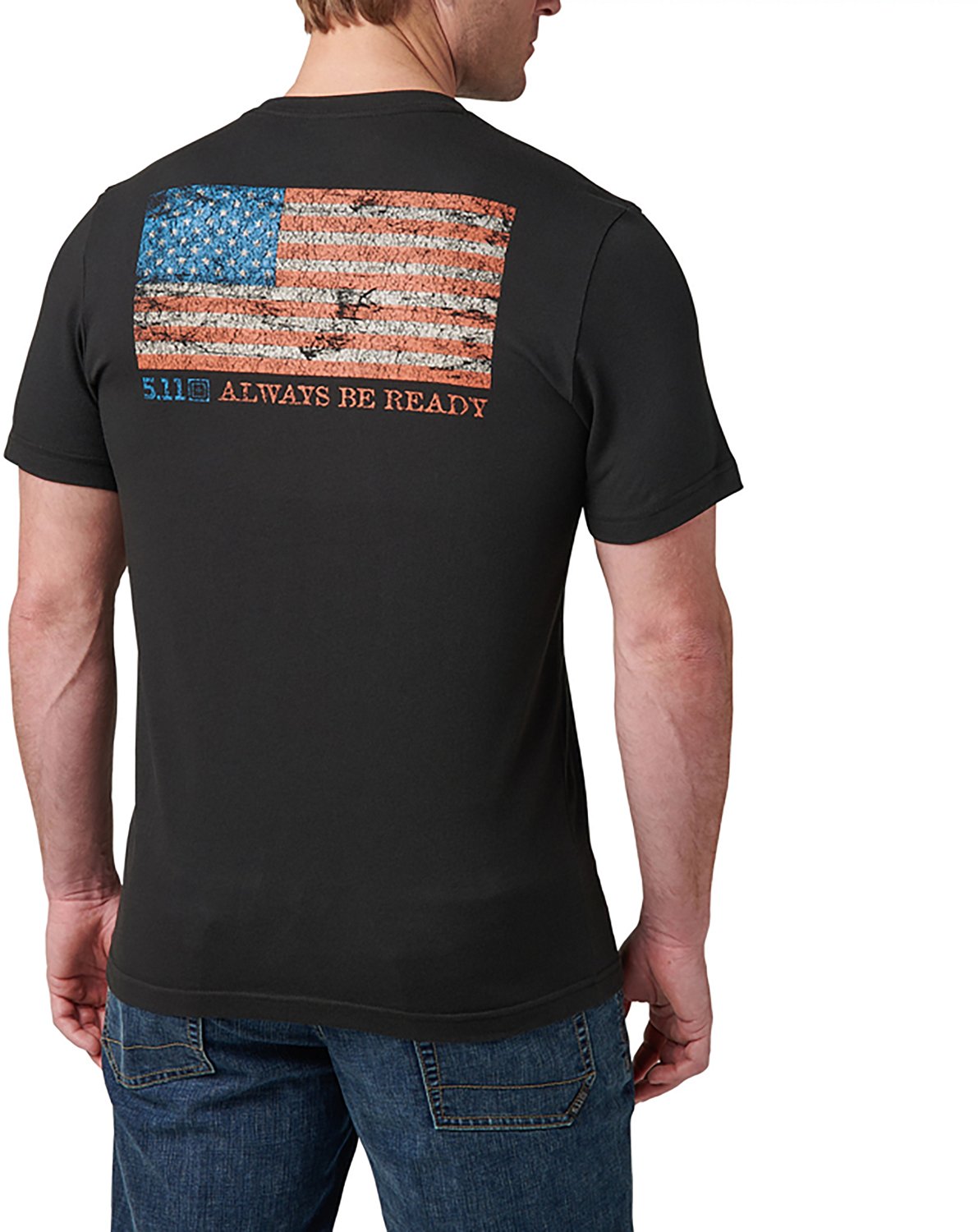 Feel confident in the 5.11 Tactical Men's American Flag Short Sleeve Shirt. The 60% cotton and 40% polyester jersey construction offers a soft feel all day, and the double-needle stitching on hems and sleeves provide additional strength. The American flag design on the back adds a fashionable touch, and the premium ink lasts through the long days.