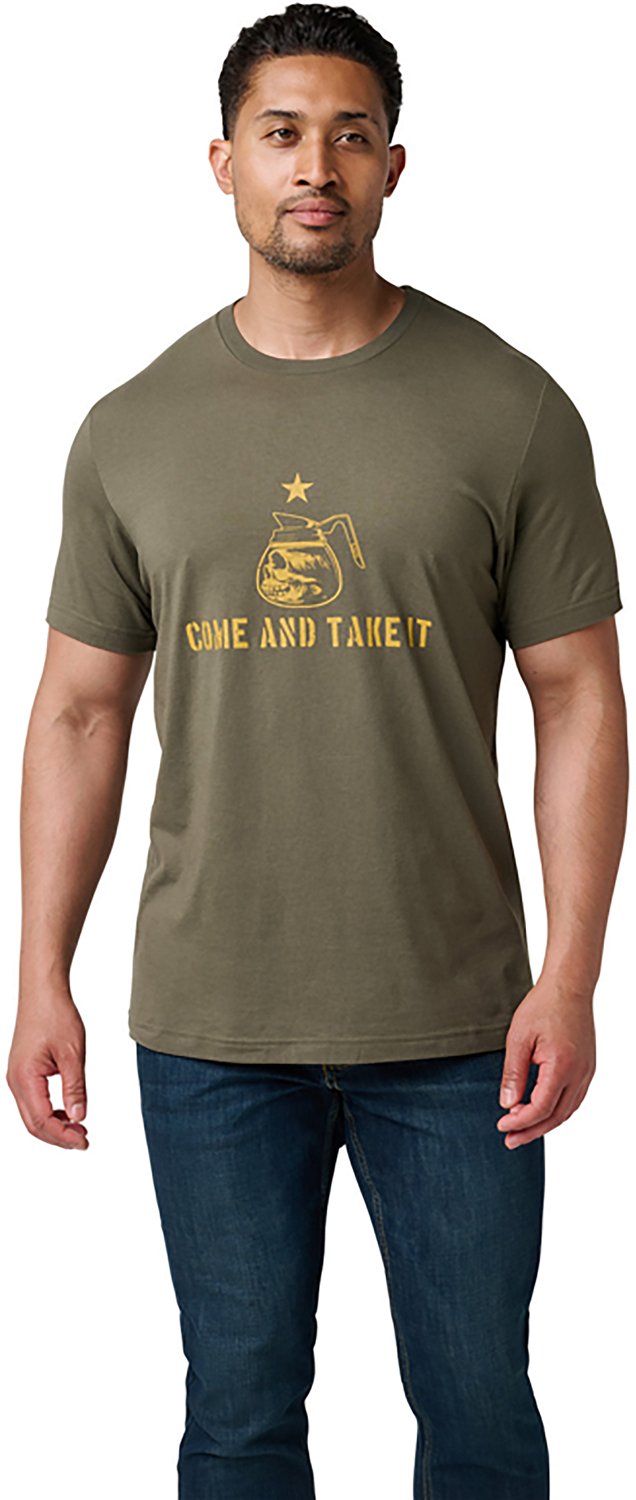 Featuring a midweight, moisture-wicking jersey fabric comprised of 60% cotton and 40% polyester, this 5.11 Tactical Men's Come And Take It T-shirt keeps you comfortable and dry on the go. The double-needle stitching on its hems and sleeves provides durability, while fade-resistant inks prevent the shirt discoloring in the sun, keeping it looking newer, longer.