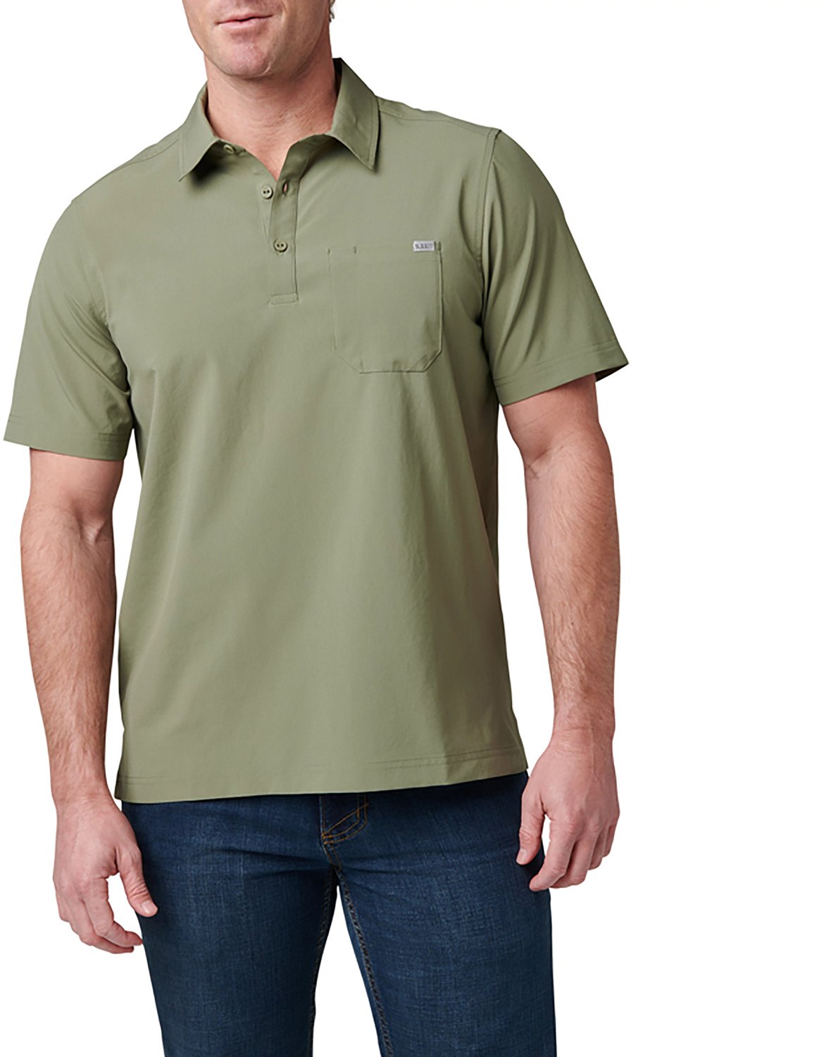 Step out feeling confident with the 5.11 Tactical Men's Flex Short Sleeve Polo Shirt. The 100% polyester plain weave with Enduro-Flexâ„¢ properties offers a stretchy feel all day, and the woven label on the left chest pocket displays your brand pride. The moisture-wicking technology delivers a dry feel, and the internal heat transfer main label enhances comfort.