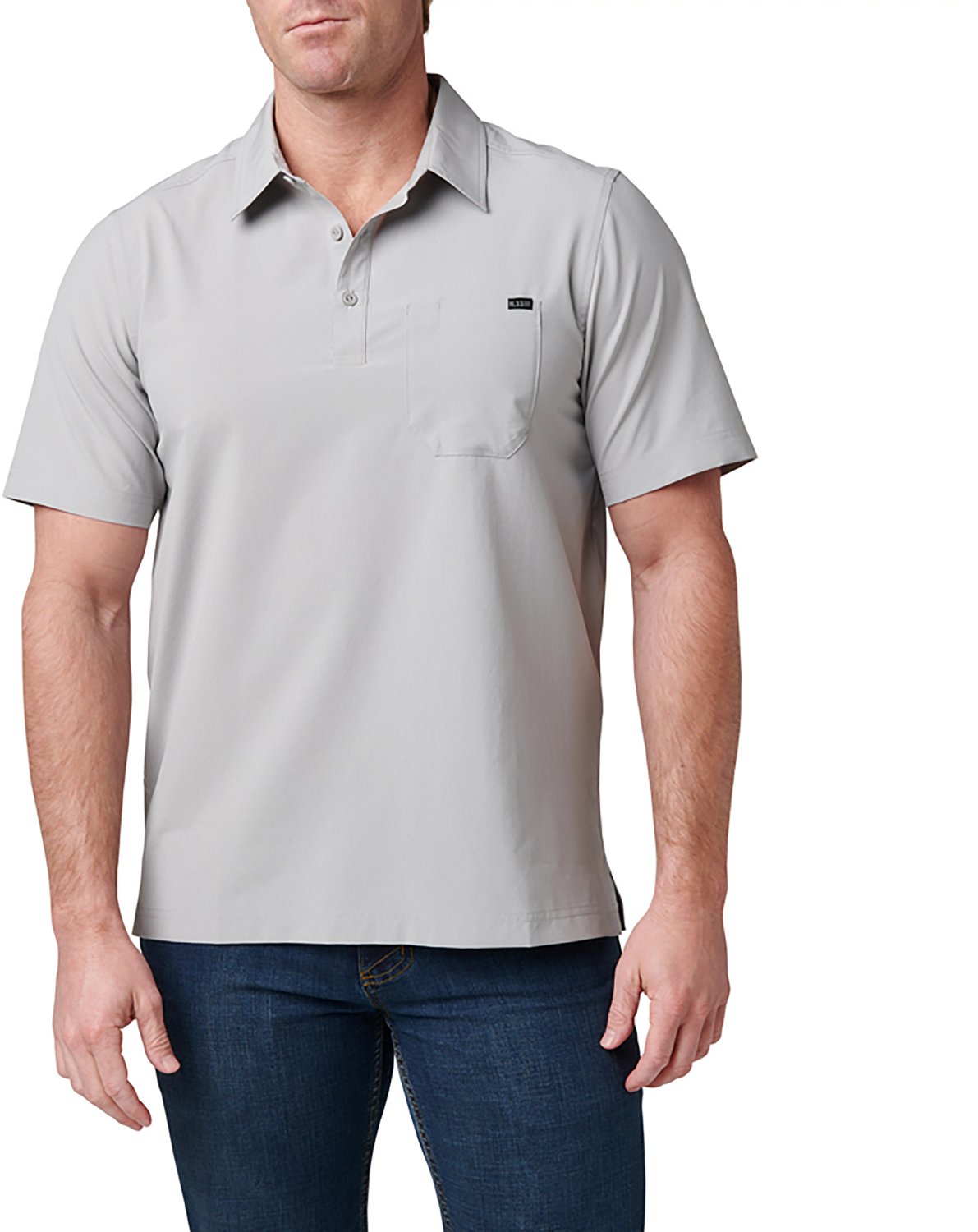 Step out feeling confident with the 5.11 Tactical Men's Flex Short Sleeve Polo Shirt. The 100% polyester plain weave with Enduro-Flexâ„¢ properties offers a stretchy feel all day, and the woven label on the left chest pocket displays your brand pride. The moisture-wicking technology delivers a dry feel, and the internal heat transfer main label enhances comfort.