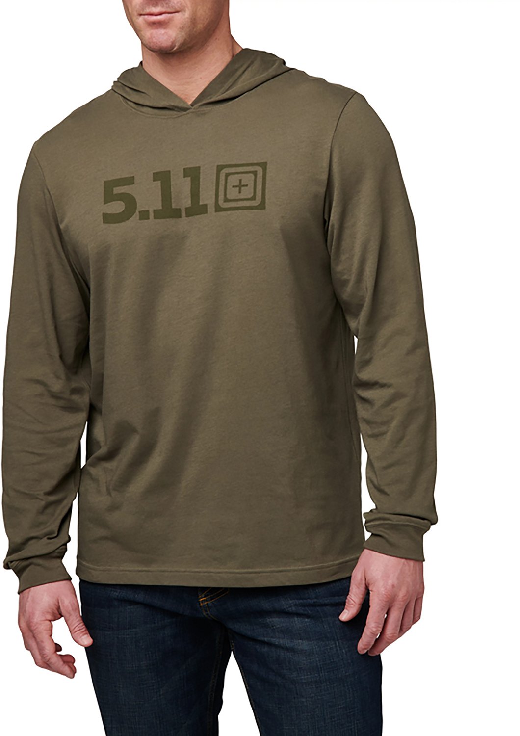 Feel confident in the 5.11 Tactical Men's Logo Hooded Long Sleeve Shirt. The 60% cotton and 40% polyester jersey construction offers a soft feel all day, and the double-needle stitching on hems and sleeves provide additional strength. The chest logo displays your brand pride, and the premium ink lasts through the long days.