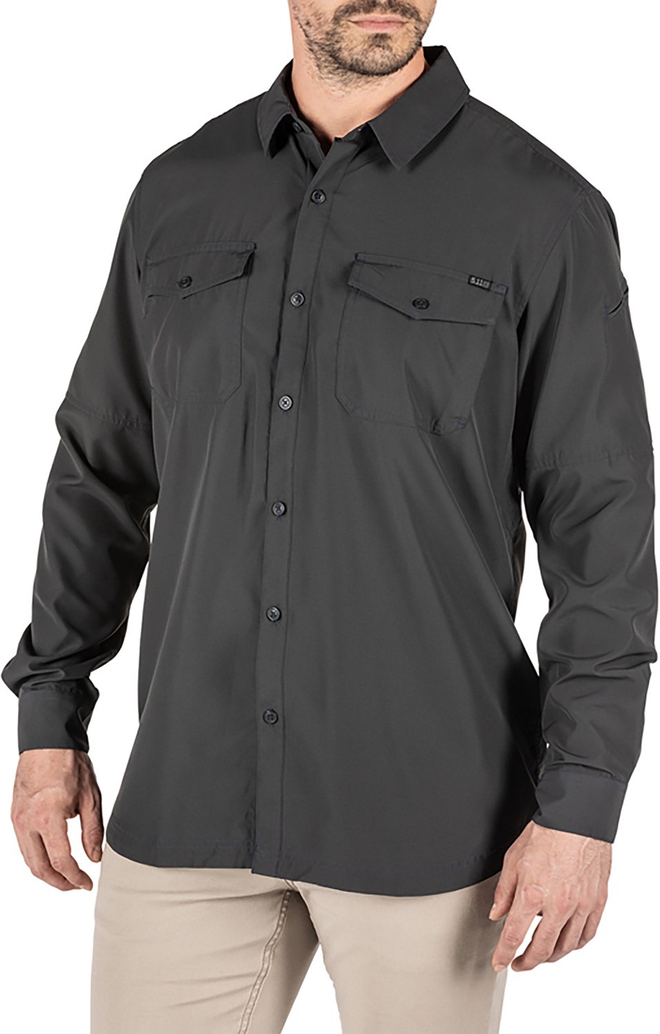 Step out feeling confident in the 5.11 Tactical Men's Marksman Long Sleeve Shirt. The 100% polyester aero tech poplin construction offers long-lasting dependability, and the woven label at the left chest pocket displays your brand pride. The moisture-wicking design delivers a dry feel, and the chest pockets with flap closure provide room to conceal items.