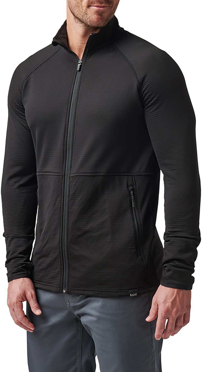 Step out feeling confident in the 5.11 Tactical Men's Stratos Fleece Long Sleeve Jacket. The 91% polyester and 9% elastane grip fleece construction offers a stretchy feel all day, and the moisture-wicking technology delivers a dry feel. The logo flag label at the left hem displays your brand pride, and the brushed tricot lined inner collar provides additional comfort.