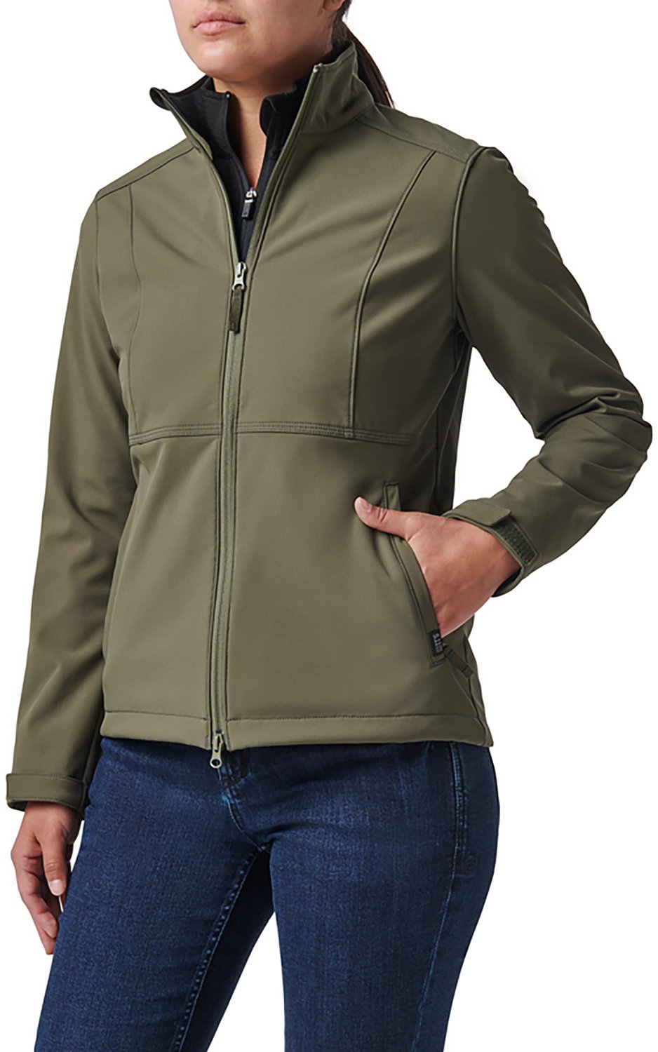 You can stay warm and dry with help from the 5.11 Tactical Women's Leone Softshell Jacket, which features a DWR finish to repel water. The lightweight jacket is made of nylon, elastane and polyester for softness and stretchability, and its multiple pockets make it easy for you to bring along everything you need.