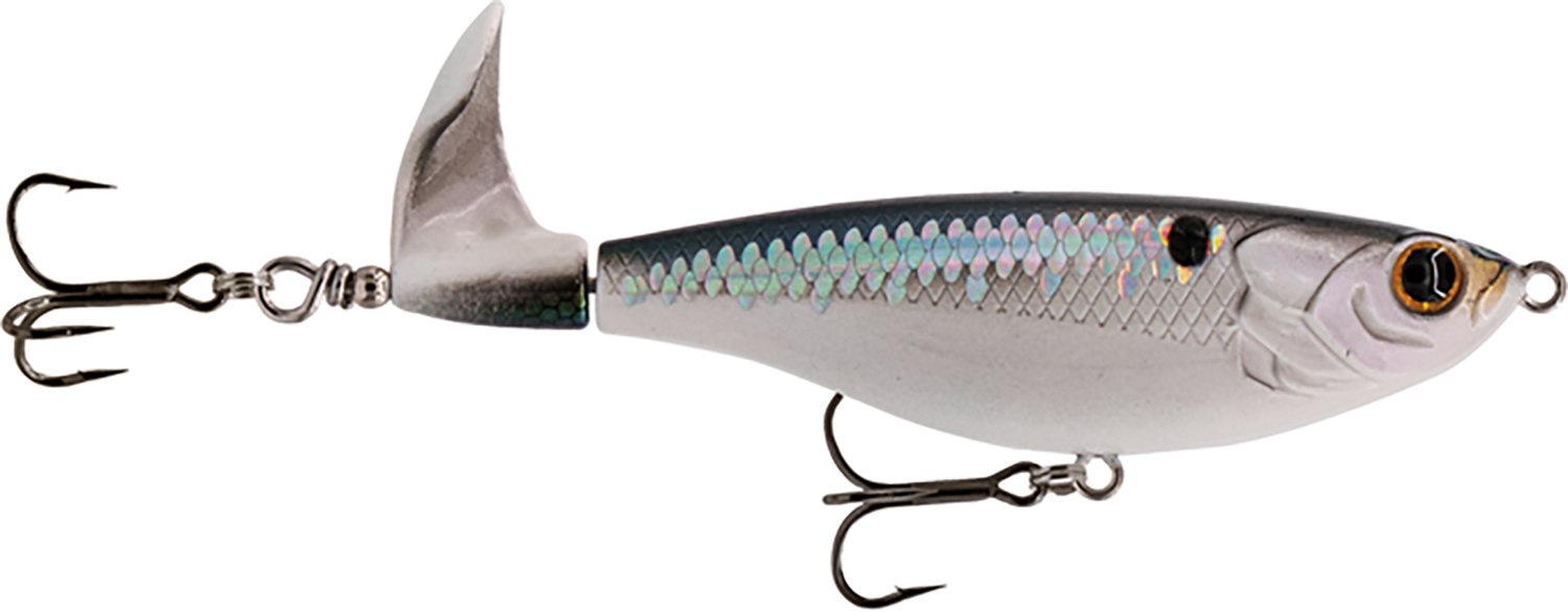 Rotating tail churns through the water with a loud, sputtering disturbance, mimicking the frantic sounds and movements of an injured baitfish