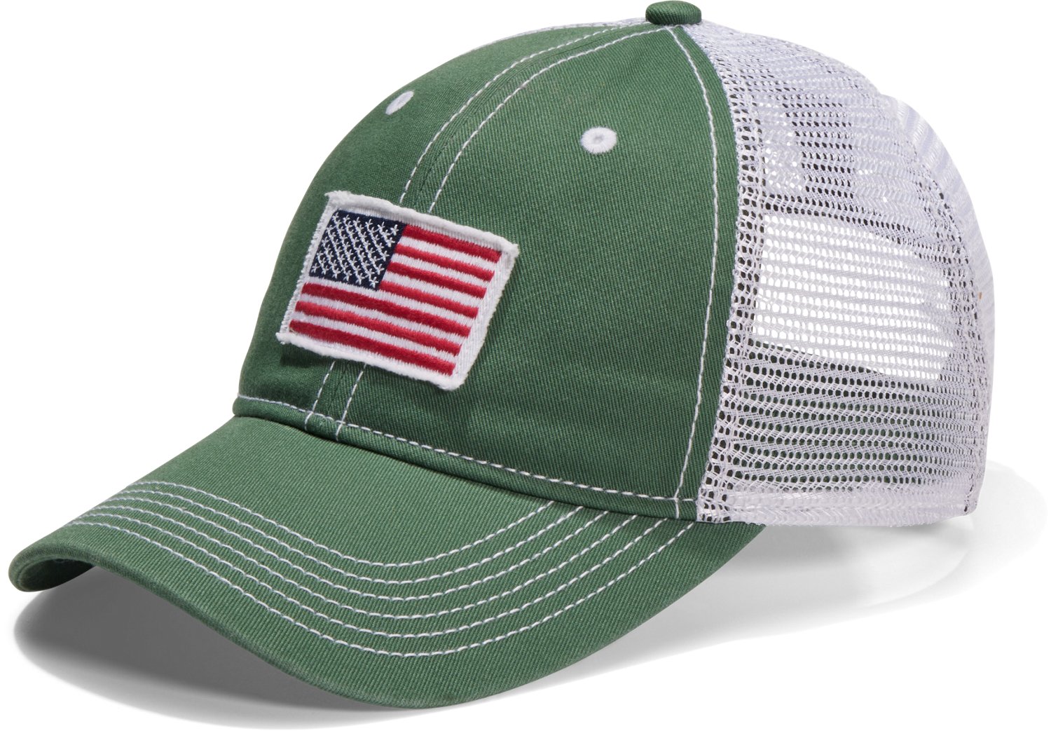 The Academy Sports + Outdoorsâ„¢ Men's American Flag Trucker Hat is made of 100% cotton twill for a lightweight profile, and the mesh backing offers added breathability. The classic trucker style delivers a timeless look, and the flag graphic shows your true colors.