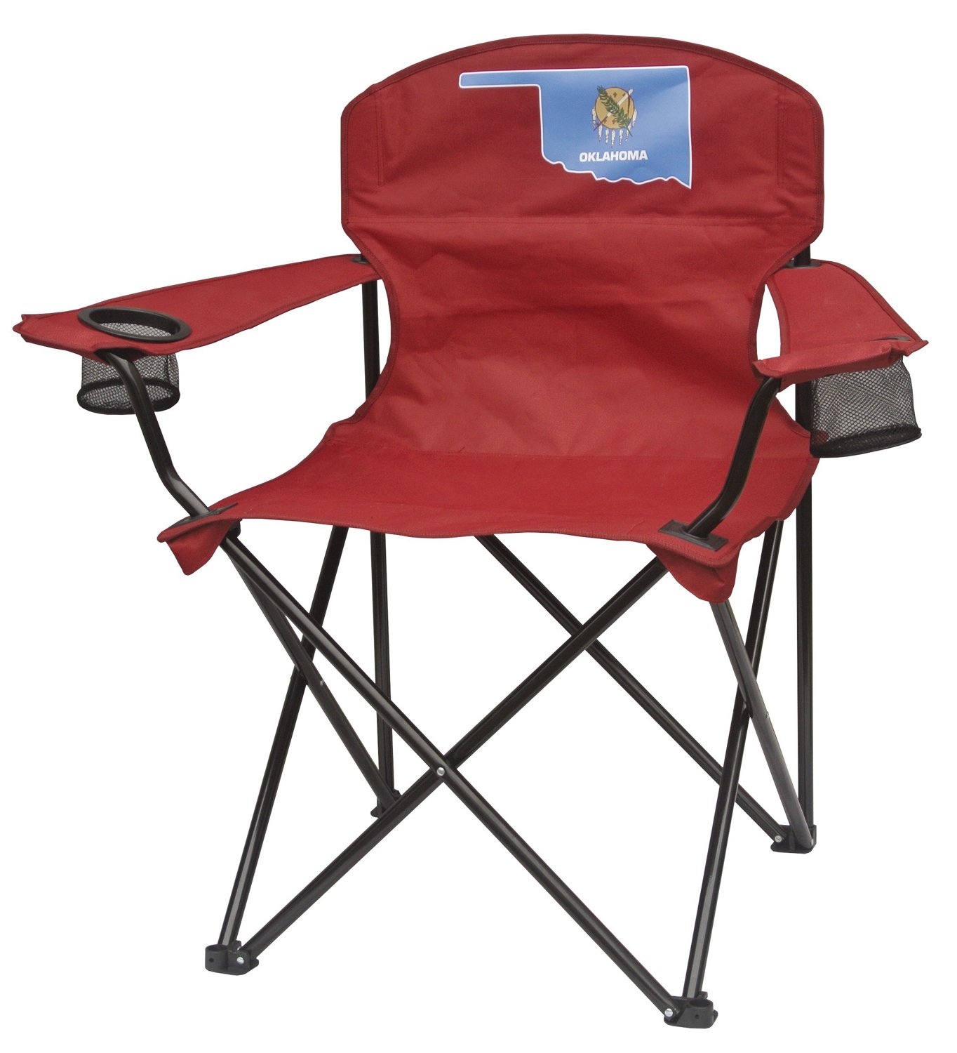 Represent your Oklahoma pride with the Academy Sports + Outdoors Oklahoma Folding Chair. This folding chair features a powder-coated steel frame with a polyester seat for durability and padded armrests for added comfort. The Oklahoma graphics show your love for your state.