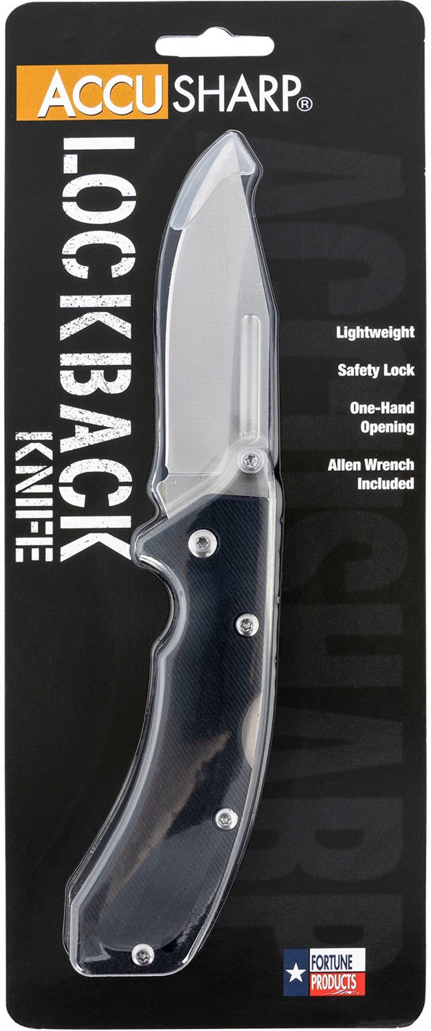 The AccuSharp 3 in Lockback Knife is a versatile cutting tool featuring a folding stainless-steel blade that stays securely open or closed with a safety lock. A removable opening pin allows single-handed use, while an included Allen wrench is convenient in case of emergency.