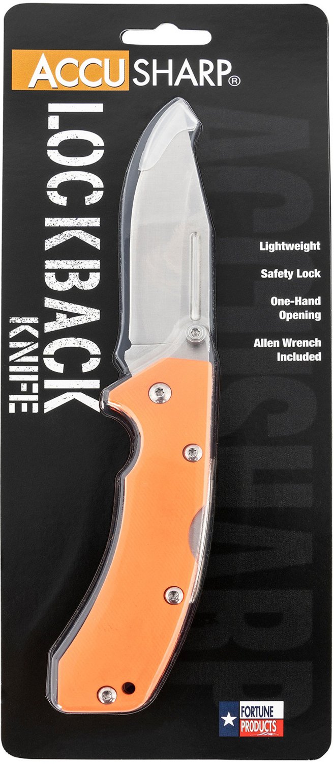 The AccuSharp 3 in Lockback Knife is a versatile cutting tool featuring a folding stainless-steel blade that stays securely open or closed with a safety lock. A removable opening pin allows single-handed use, while an included Allen wrench is convenient in case of emergency.