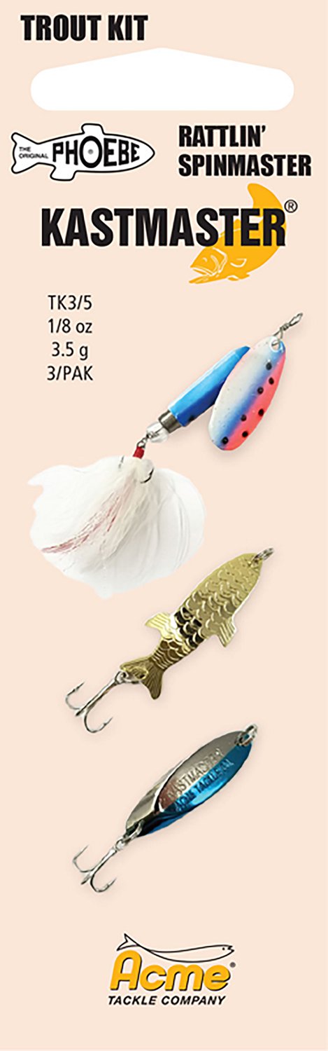 Whether you are looking to fill your boat with fish or just relax in the sun, reach for the Acme 1/8 oz Trout Lure Kit. The kit is great for trout fishing in either freshwater or saltwater applications and comes with one Rattlin' Spinmaster lure, one Phoebe lure and one Kastmaster lure.