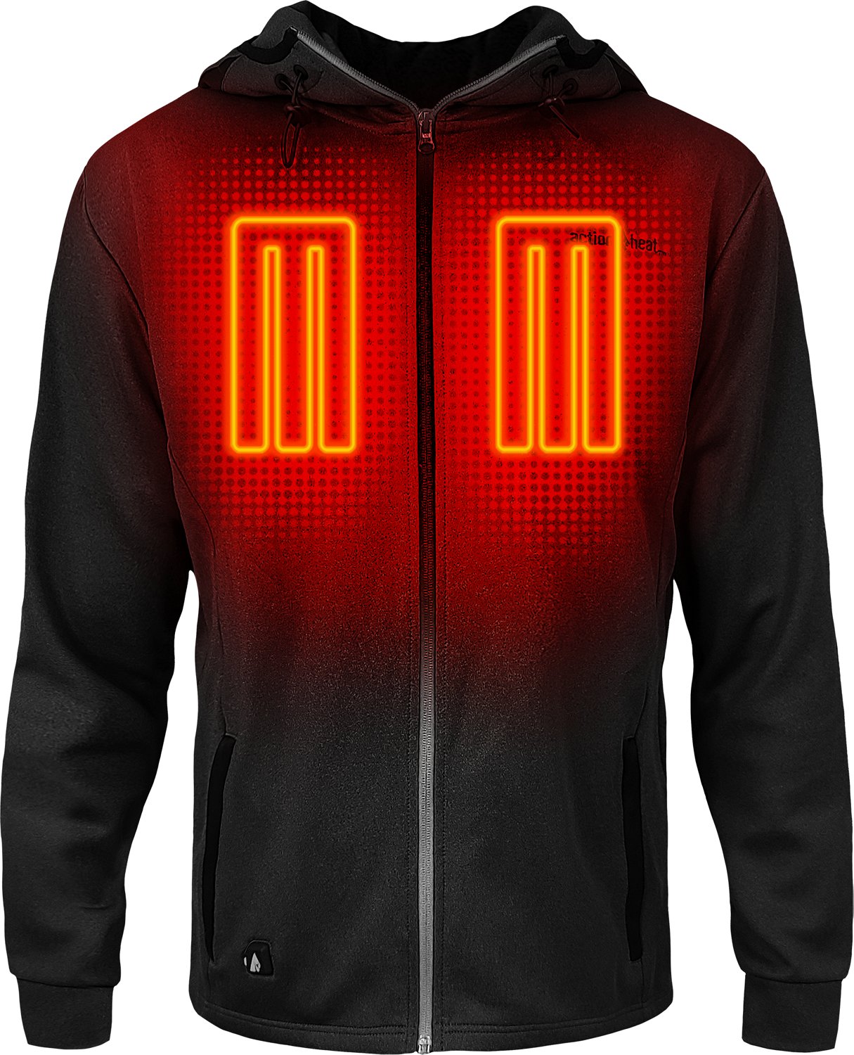 Plug in and get warm with the ActionHeat Men's Slim Fit 5V Hoodie. The polyester and spandex material stretches to move with your body. Battery-powered infrared panels are strategically placed to deliver active warming around your core, keeping you warm in the coldest conditions. The discrete battery bank provides consistent power and can also charge your electronic devices.