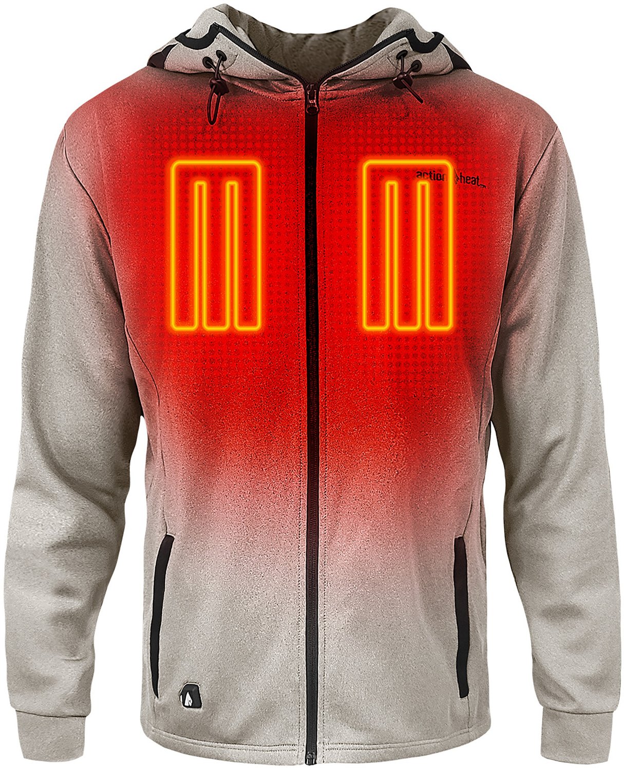Plug in and get warm with the ActionHeat Men's Slim Fit 5V Hoodie. The polyester and spandex material stretches to move with your body. Battery-powered infrared panels are strategically placed to deliver active warming around your core, keeping you warm in the coldest conditions. The discrete battery bank provides consistent power and can also charge your electronic devices.