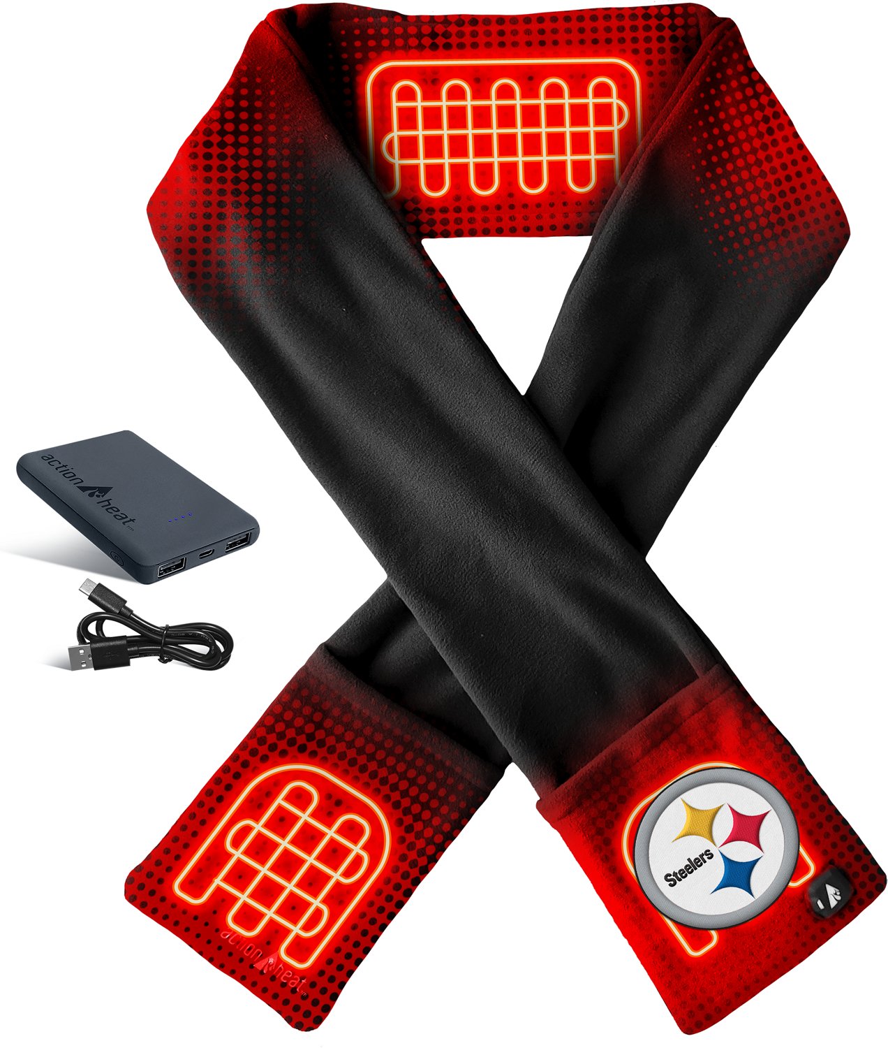 Stay warm and toasty on game day with the ActionHeat Steelers 5V Battery Heated Scarf. Support your favorite NFL team at the stadium, tailgate or any other outdoor event while you stay warm and cozy for hours. This rechargeable battery-heated scarf features reaches a comfortable temperature of 145 degrees Fahrenheit and functions as a portable battery charger for your USB-powered devices.