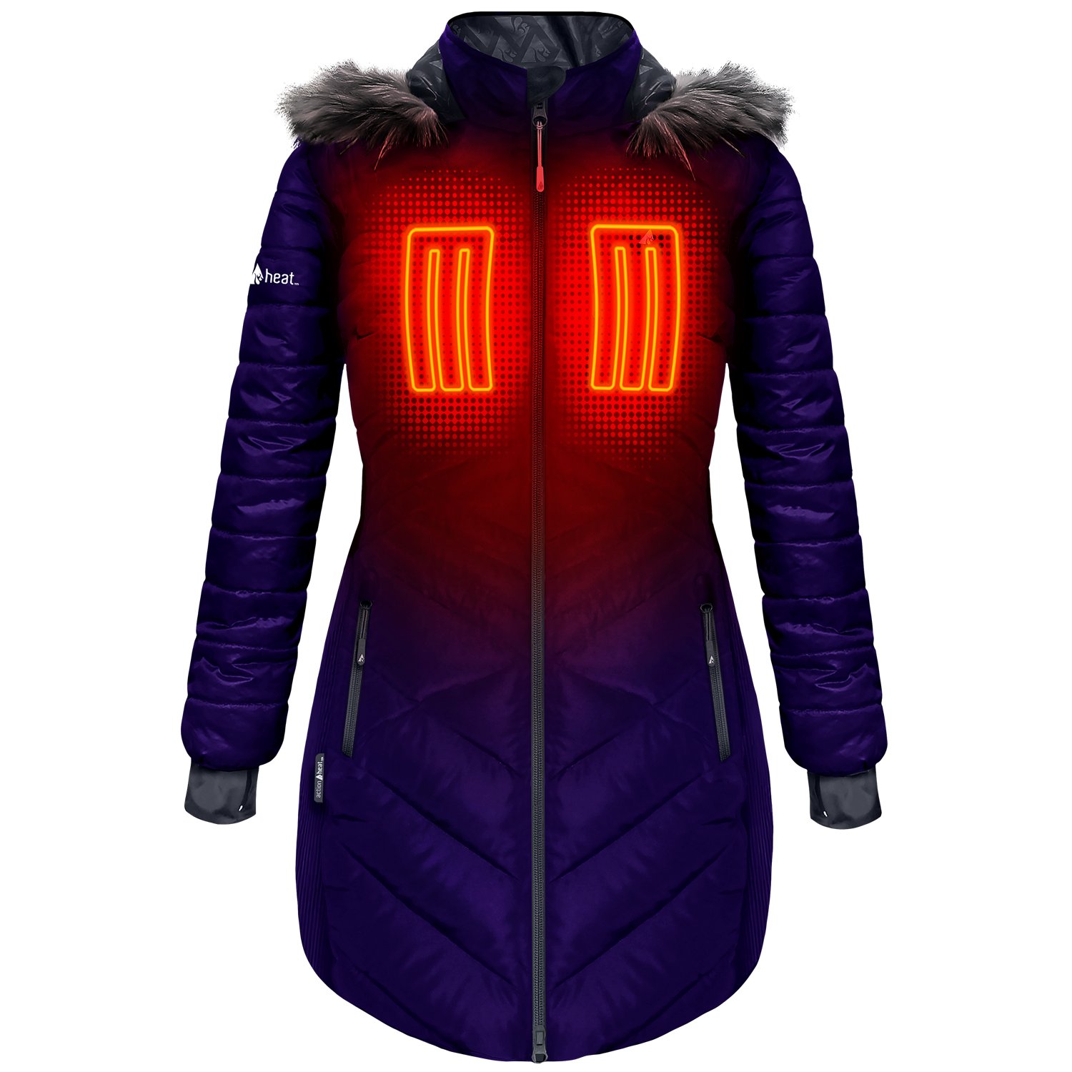 Plug in and get warm with the ActionHeat Women's 5V Battery Heated Long Hooded Puffer Jacket. The water-resistant shell keeps you dry in all weather, while insulation and an ActionWave reflective liner add warmth. Battery-powered infrared panels are strategically placed to deliver active warming around your core, keeping you warm in the coldest conditions. The discrete battery bank provides consistent power and can also charge your electronic devices.