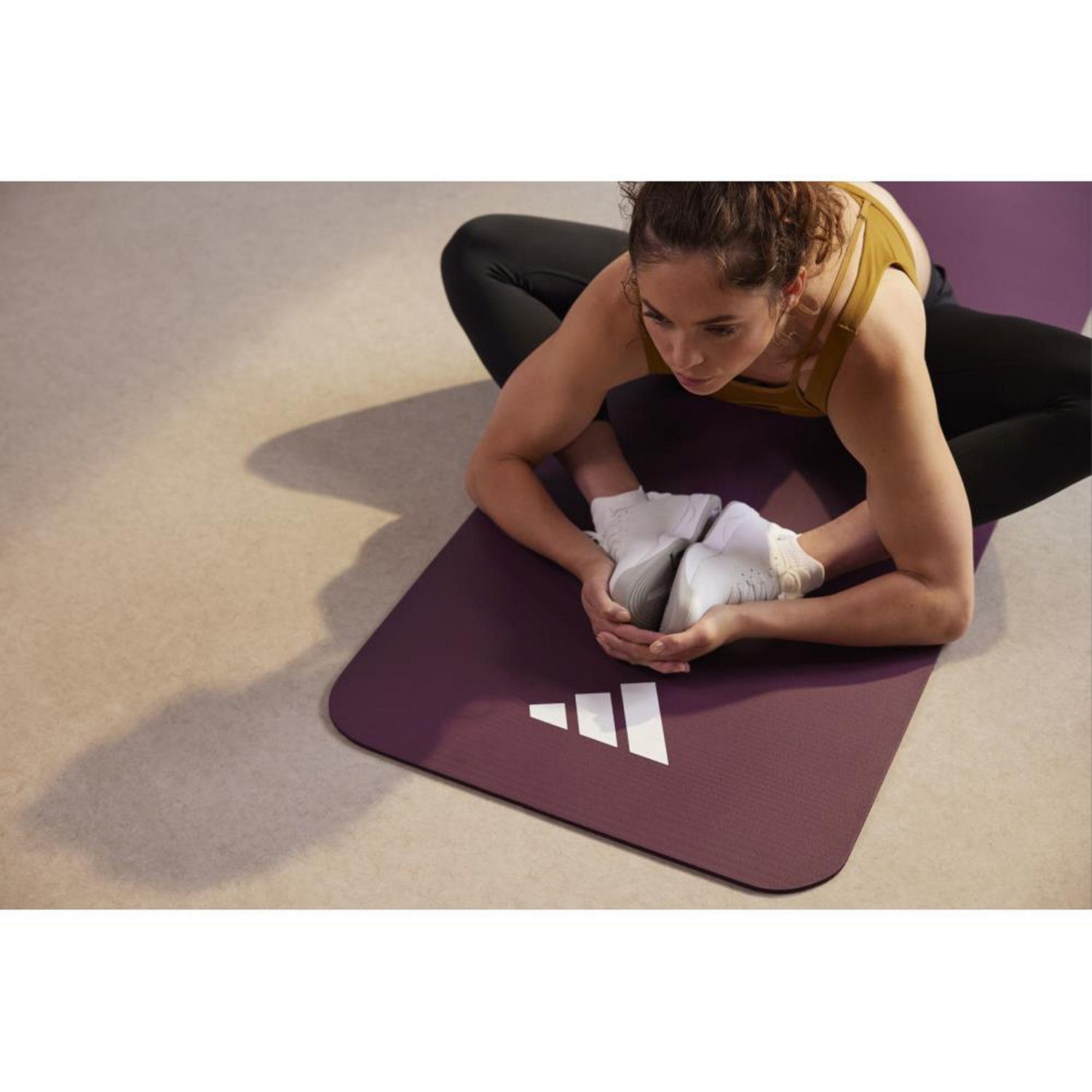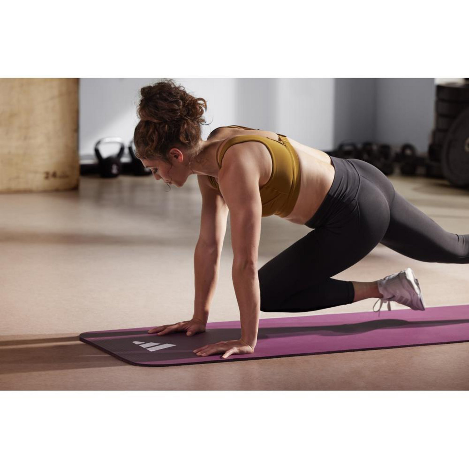 Perform your next workout at home or at the gym with the adidas 7mm Fitness Mat. A smooth surface texture provides a soft cushioned feel, while the ribbed base offers traction and stability. The NBR construction affords durability, and the roll up design enables convenient storage.