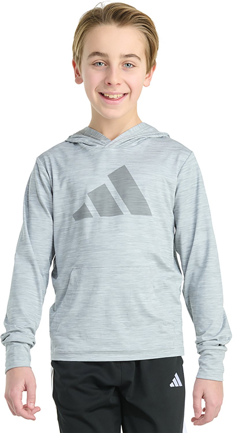 Athletes will love throwing on the adidas Boys' All Sport Polyester Pullover Hoodie and going out to play. The hood helps shield your head from the elements, and the pullover is made of 84% polyester and 16% elastane mélange jersey to deliver the warmth and softness you need to keep going.