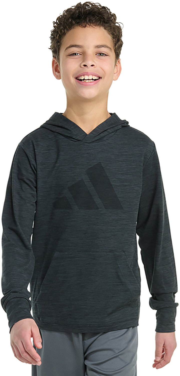 Athletes will love throwing on the adidas Boys' All Sport Polyester Pullover Hoodie and going out to play. The hood helps shield your head from the elements, and the pullover is made of 84% polyester and 16% elastane mélange jersey to deliver the warmth and softness you need to keep going.