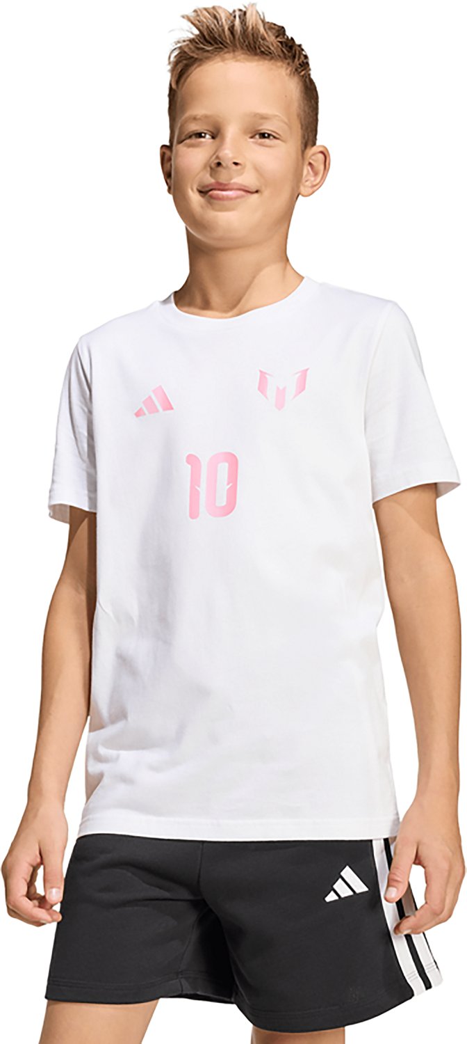 Supporting Lionel Messi is easy when you don the adidas Boys' Messi Name & Number Graphic T-shirt, which is designed with his name and number. This graphic T-shirt is made of 100% cotton single jersey to offer a soft feel, and its ribbed collar and short sleeves deliver a casual feel.