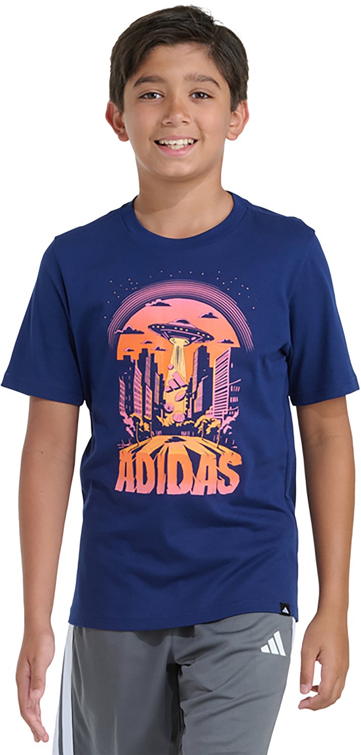 Have your little one looking their best when they wear the adidas Boys' Space City Short Sleeve T-shirt. It is made of 100% cotton jersey. The short sleeves keep them cool, and its rib-knit crewneck creates a casual look. The adidas Lineage logo screen print of a UFO city skyline with glow in the dark ink on the front adds a unique touch.